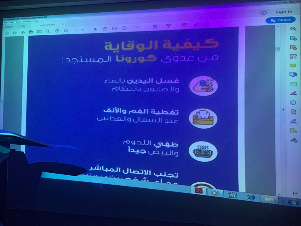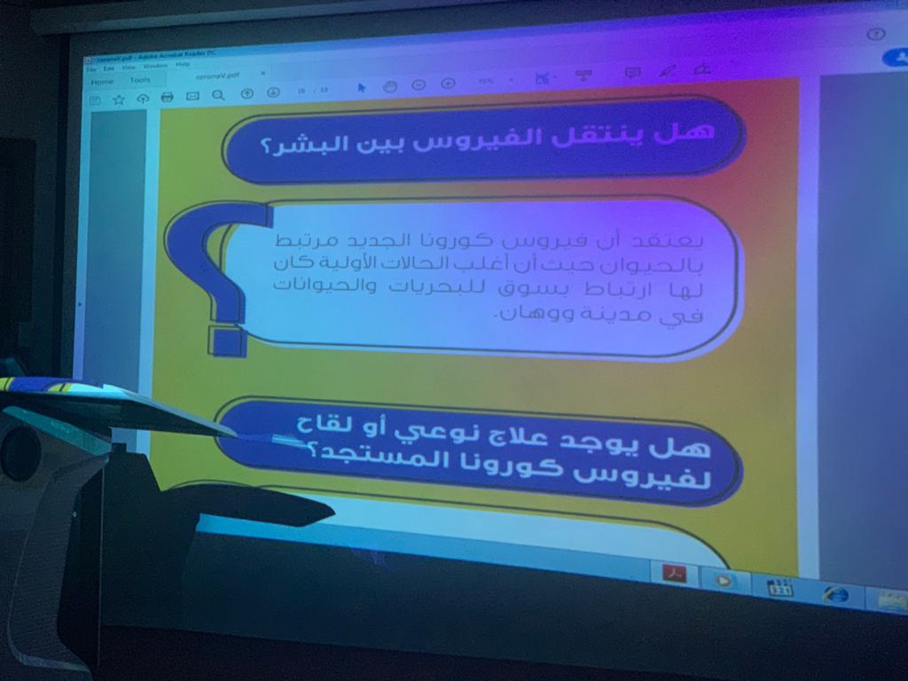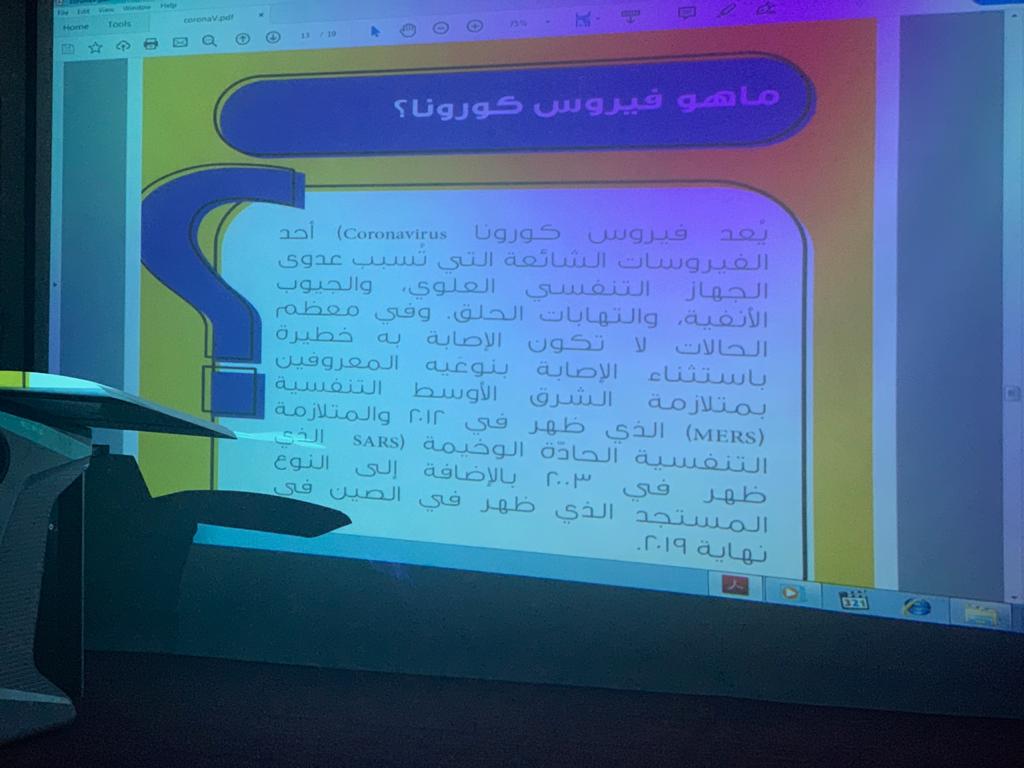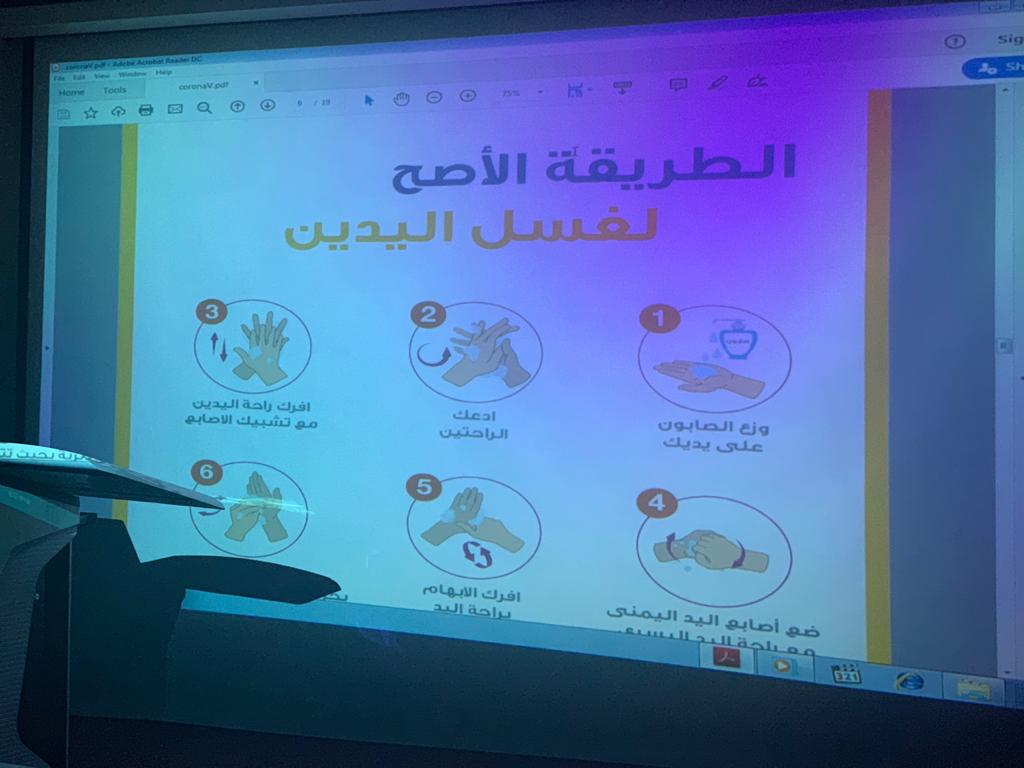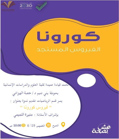 تحرص كلية العلوم والدراسات الإنسانية بحوطة بني تميم تحت قيادة عميدة الكلية د. حصة بن سعود الهزاني .إلى توعية الطالبات ومنسوبات الكلية بخطورة فيروس كورونا، والتأكيد على تنفيذ الإجراءات الواردة من وزارة الصحة في التعامل مع الأمراض المعدية، ومن هذا المنطلق قدم قسم الرياضيات برنامج بعنوان: ( فيروس كورونا ) تحت إشراف أ. منيرة المبارك. وكان ذلك يوم الخميس الموافق: ١٤٤١/٦/١٩ هـ. وتدور محاور البرنامج حول فيروس كورونا المستجد. حيث تم التعريف بالفيروس وكيفية الوقاية من العدوى، وعرض الطريقة الصحيحة لتعقيم اليدين. وأيضاً تم عرض احصائيات بعدد الاصابات والوفيات حول العالم، وتمت الإجابة على أكثر الاسئلة الشائعة حول الموضوع. وفي الختام تم توزيع منشورات حول الطريقة الأصح لغسل اليدين ومتى يجب غسل اليدين، بالإضافة لبعض المنشورات التوعوية متمنين من ﷲ العيش في مجتمع صحي وسليم.