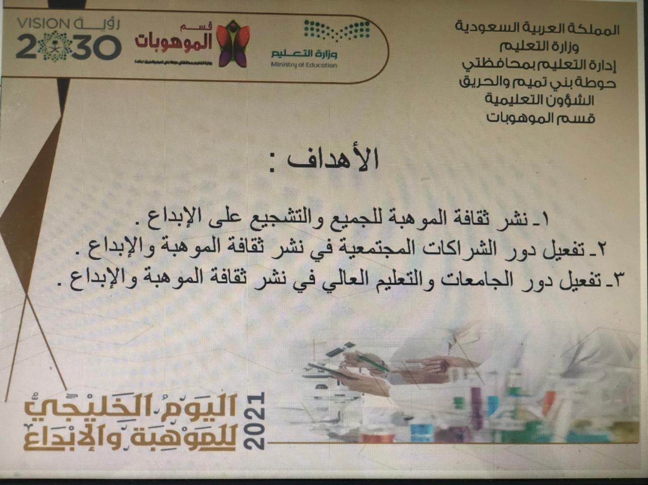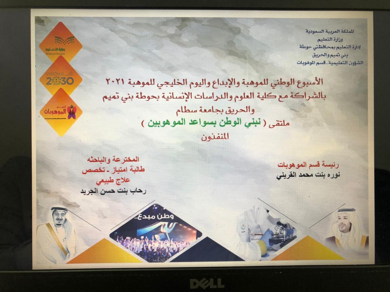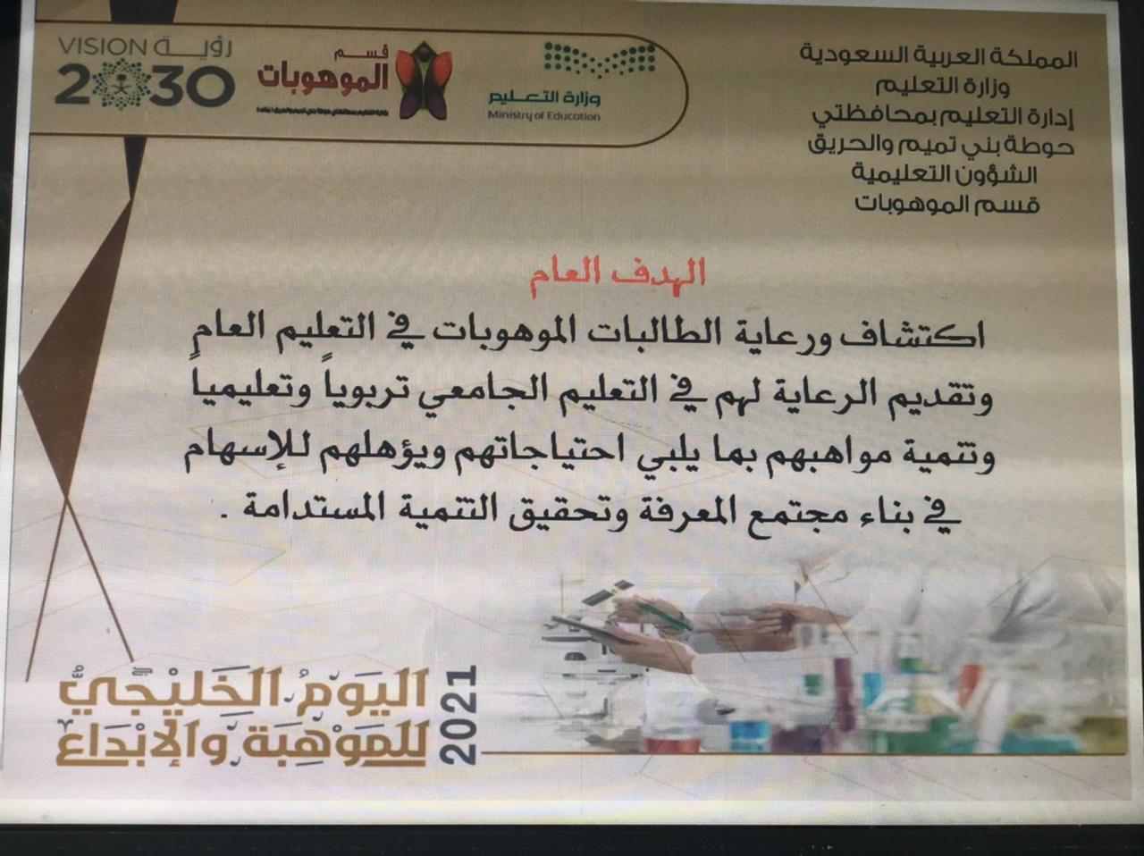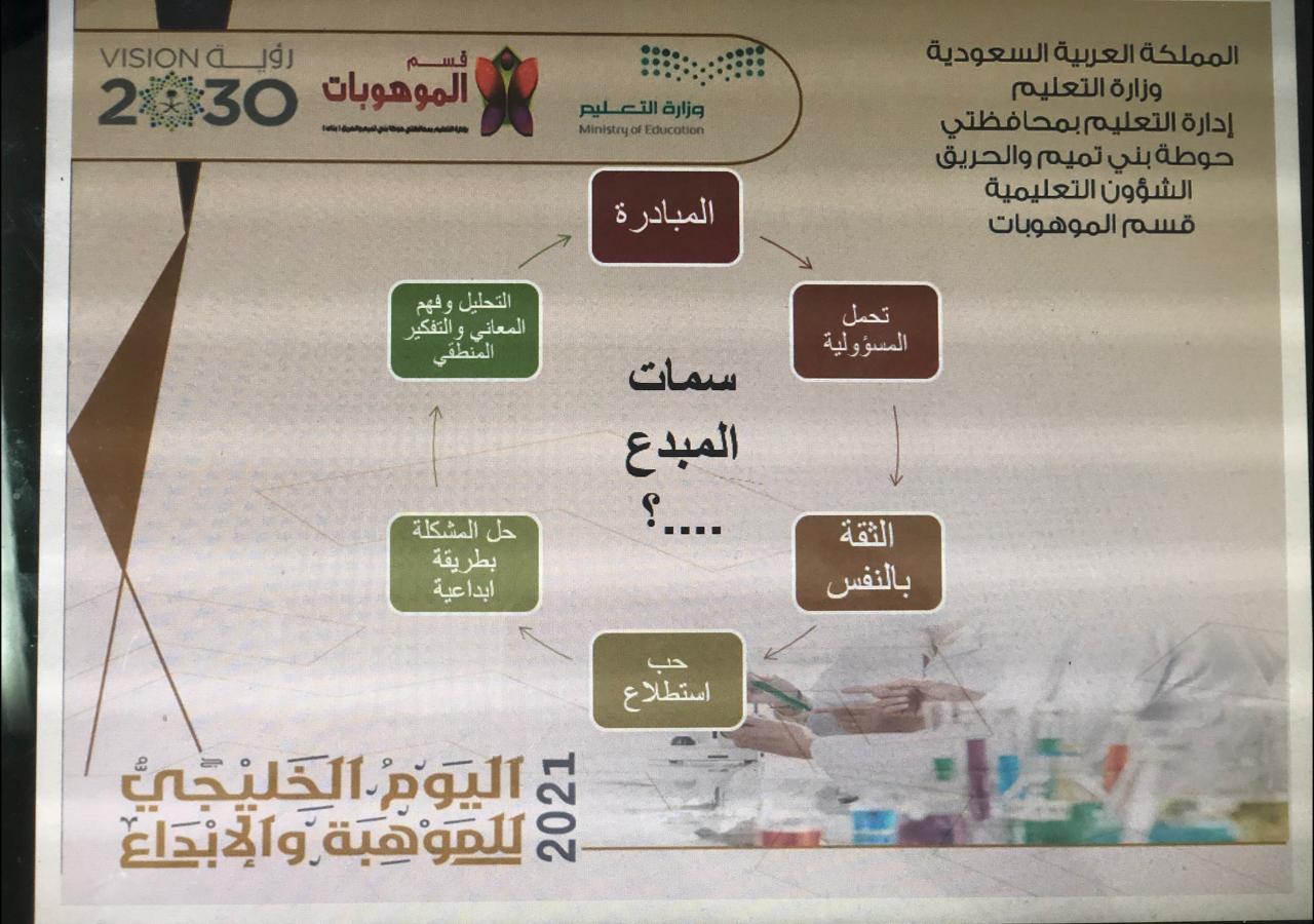 تزامناً مع الأسبوع الوطني للموهبة والإبداع واليوم الخليجي للموهبة2021، وإيماناً من كلية العلوم والدراسات الإنسانية بحوطة بني تميم برعاية عميدة الكلية د. حصة بنت سعود الهزاني بضرورة تعزيز دورها في تفعيل خطة التحول 2030 عن طريق تفعيل الشراكة المجتمعية.