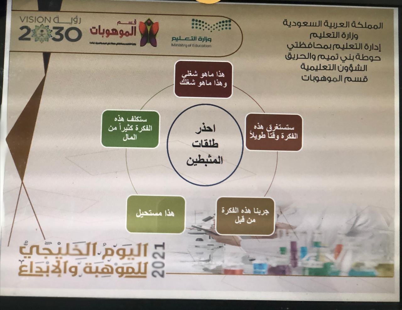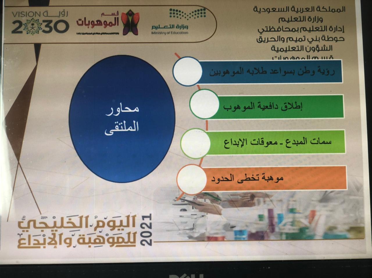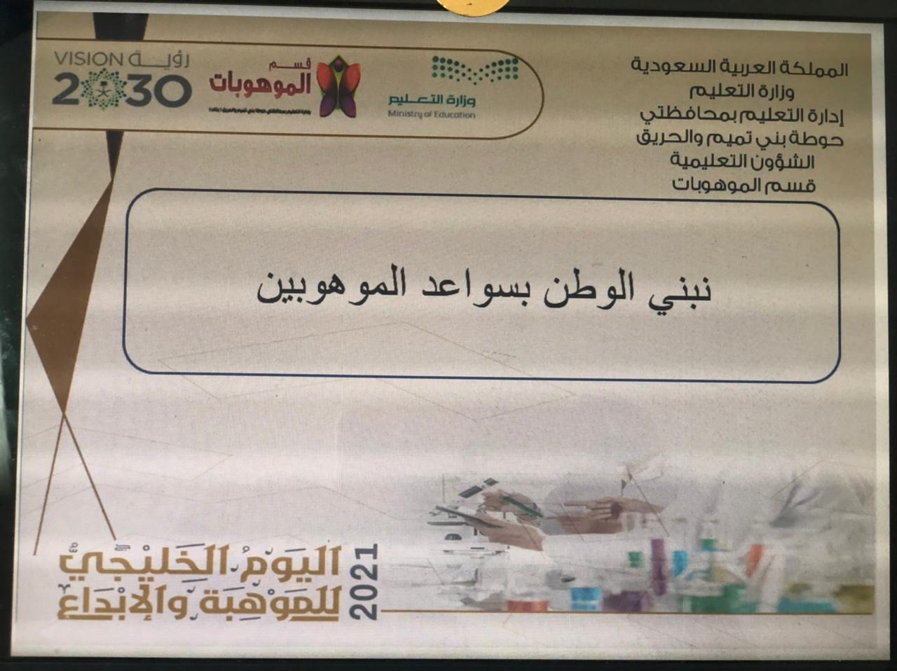 تزامناً مع الأسبوع الوطني للموهبة والإبداع واليوم الخليجي للموهبة2021، وإيماناً من كلية العلوم والدراسات الإنسانية بحوطة بني تميم برعاية عميدة الكلية د. حصة بنت سعود الهزاني بضرورة تعزيز دورها في تفعيل خطة التحول 2030 عن طريق تفعيل الشراكة المجتمعية.