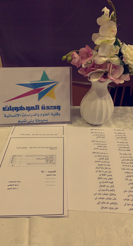 وتبقى المواهب رمزاً لإشعال الهمم لتوقد القيم، حيث أقامت وحدة الموهوبات تحت رعاية عميدة كلية العلوم والدراسات الإنسانية بحوطة بني تميم سعادة الدكتورة/ حصة بنت سعود الهزاني برنامج التحدي الثالث بعنوان (تحدي أبيات صوت صفير البلبل) بإشراف أ/ مها الصقعبي وبمساعدة أ/ منال الدحيم في يوم الأحد الموافق ١٤٤٣/٧/١٩هـ بمسرح الكلية بتمام الساعة ١٠:٣٠صباحًا. عدد المشاركات (٣) طالبات، كما تتكون لجنة التحكيم من سعادة الدكتورة/ بيان إبراهيم السيف وكيلة الشؤون التعليمية والأكاديمية، والدكتورة/ ناديه الأمين رئيسة وحدة التسجيل وشؤون الطالبات.