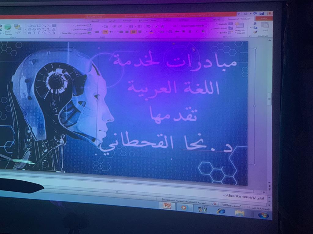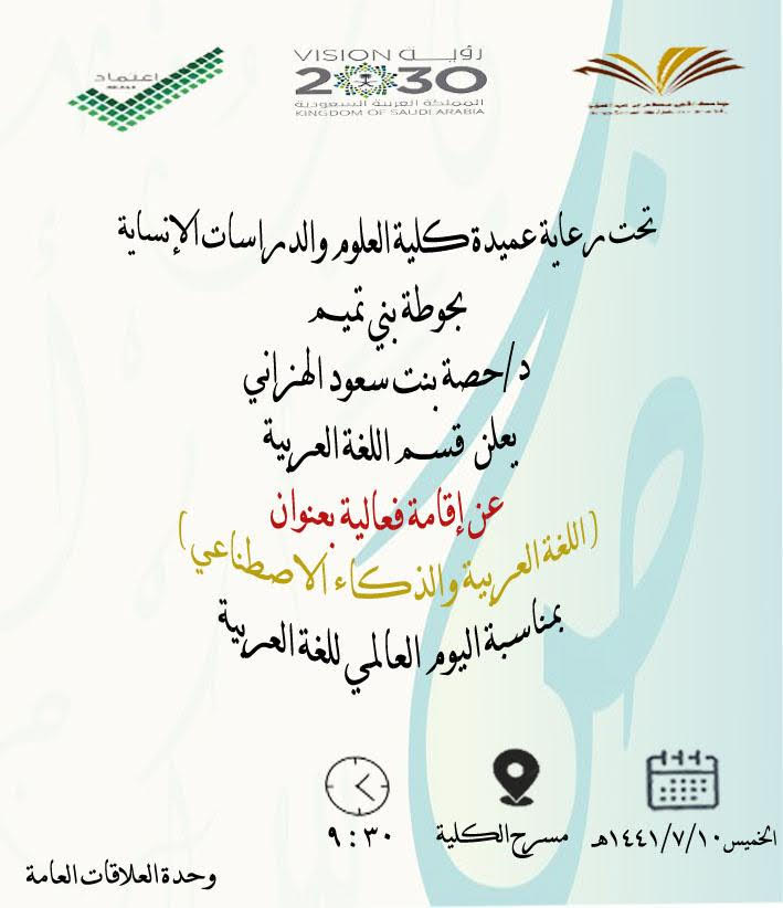 ضمن أنشطة قسم اللغة العربية للاحتفاء باللغة العربية وتمكينها في العالم الرقمي وتحت قيادة عميدة كلية العلوم والدراسات الإنسانية د. حصة بنت سعود الهزاني أقام قسم اللغة العربية برنامج( اللغة العربية والذكاء الاصطناعي) يوم الخميس ١٠/ ٧/ ١٤٤١هـ. حيث ابتدأ البرنامج بآيات من القرآن الكريم، ثم مبادرة لخدمة اللغة العربية قدمتها د. نحا القحطاني، واللغة العربية والعولمة من تقديم د. عبير عبدالحكيم.، وأخيرا لفتة عن القصيدة الرقمية د. أميرة صالح. وقد تخلل ذلك بعض الحوارات والمشاركات من طالبات قسم اللغة العربية وبعض طالبات الأقسام الأخرى، وكان ذلك في إطار علمي لقي استحسان الحاضرات من أعضاء هيئة التدريس والطالبات، حيث تناوبن المداخلات الفاعلة لتمكين اللغة العربية في زمن الرقمنة.