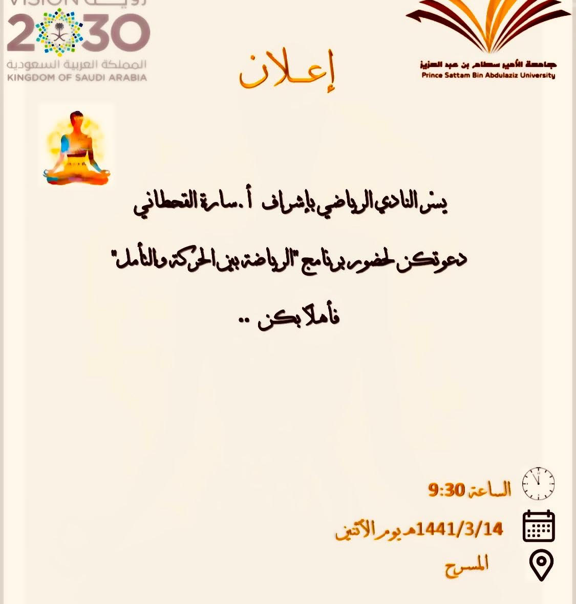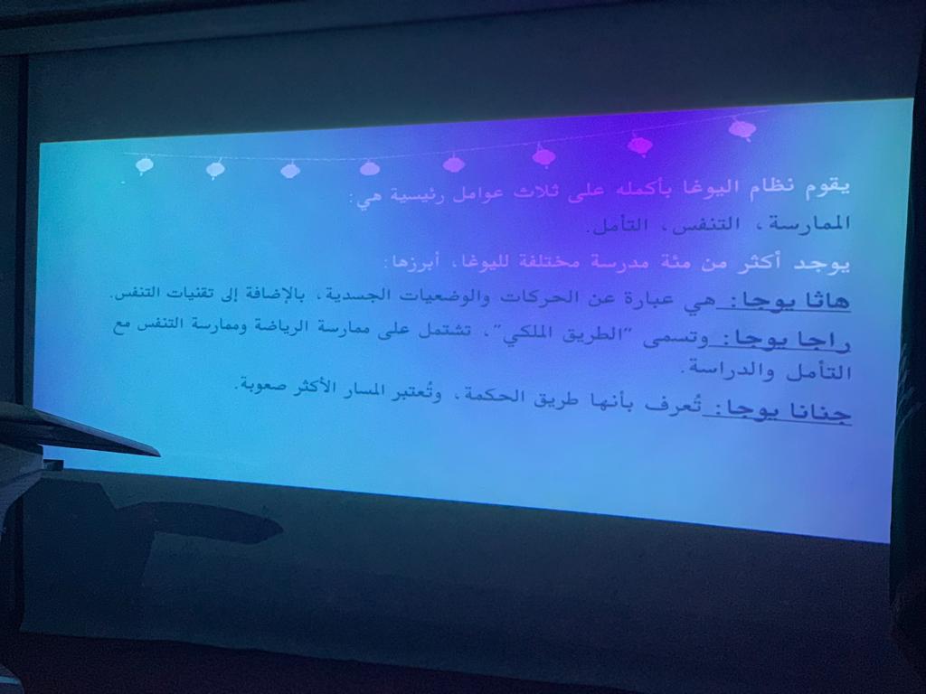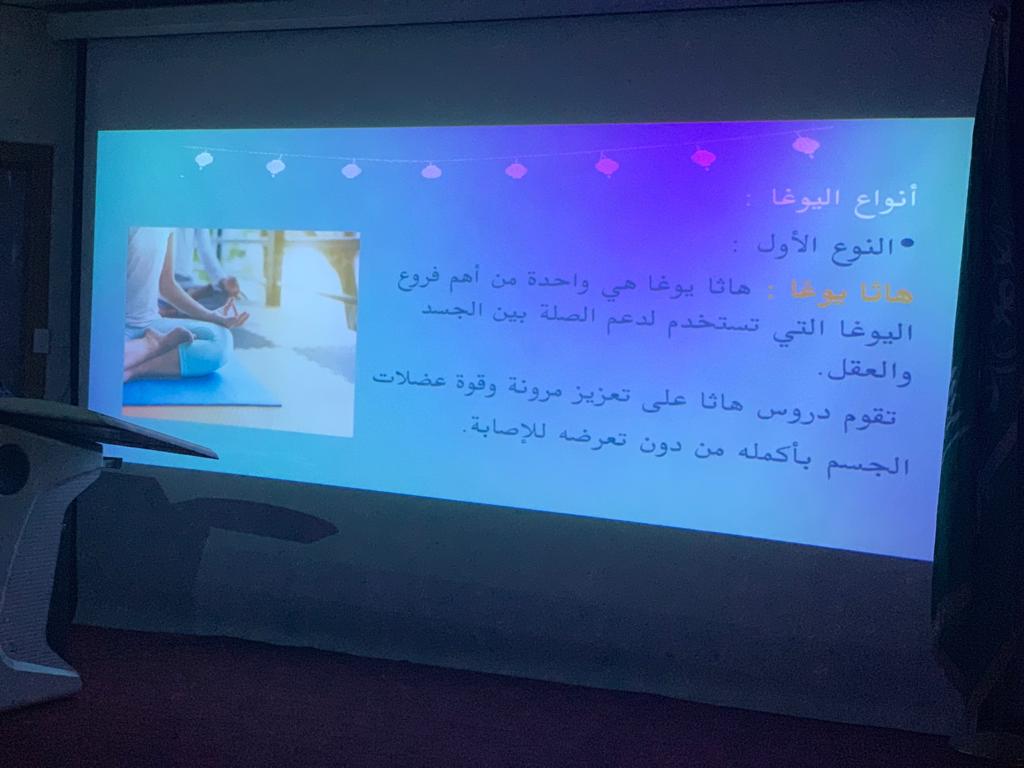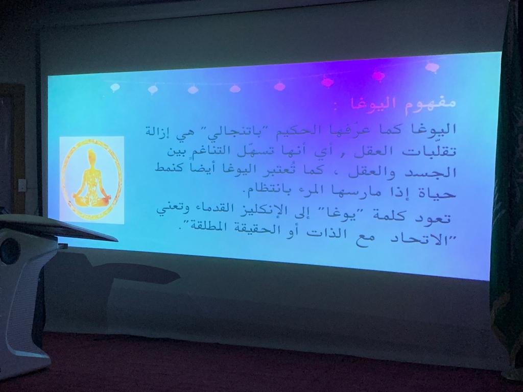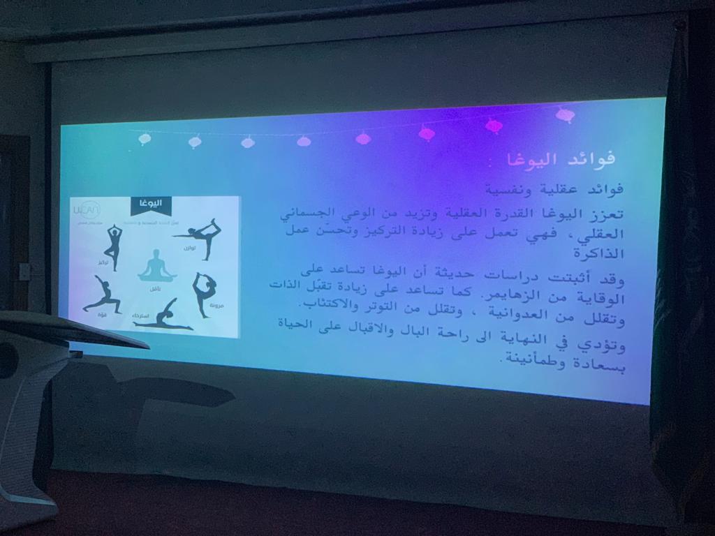 لاشك بأن الرياضة جزء مهم في حياة الإنسان، تكسو عمره فائدة ومتعة، وبظل قيادة عميدة كلية العلوم والدراسات الإنسانية د. حصة بنت سعود الهزاني، نظم النادي الرياضي بإشراف: أ. سارة القحطاني برنامجًا توعوياً عن " الرياضة بين الحركة والتأمل" ، يوم الاثنين الموافق: 1441/3/14هـ الساعة 9:30 صباحاً في مسرح الكلية ابتدأ بعرض يبين مفهوم التأمل ممثلًا "برياضة اليوغا"، وأنواعها وفوائدها، وأهم شروطها، وأثرها على نفس الإنسان وعقله وروحه، كما شمل العرض الفرق بين رياضة الحركة والتأمل، وأبرز من اشتهر بها. رافق البرنامج ركناً للضيافة ممولاً بمنشورات توعوية، وختم البرنامج بمسابقات لقيت استحساناً وتفاعلاً من الحضور.