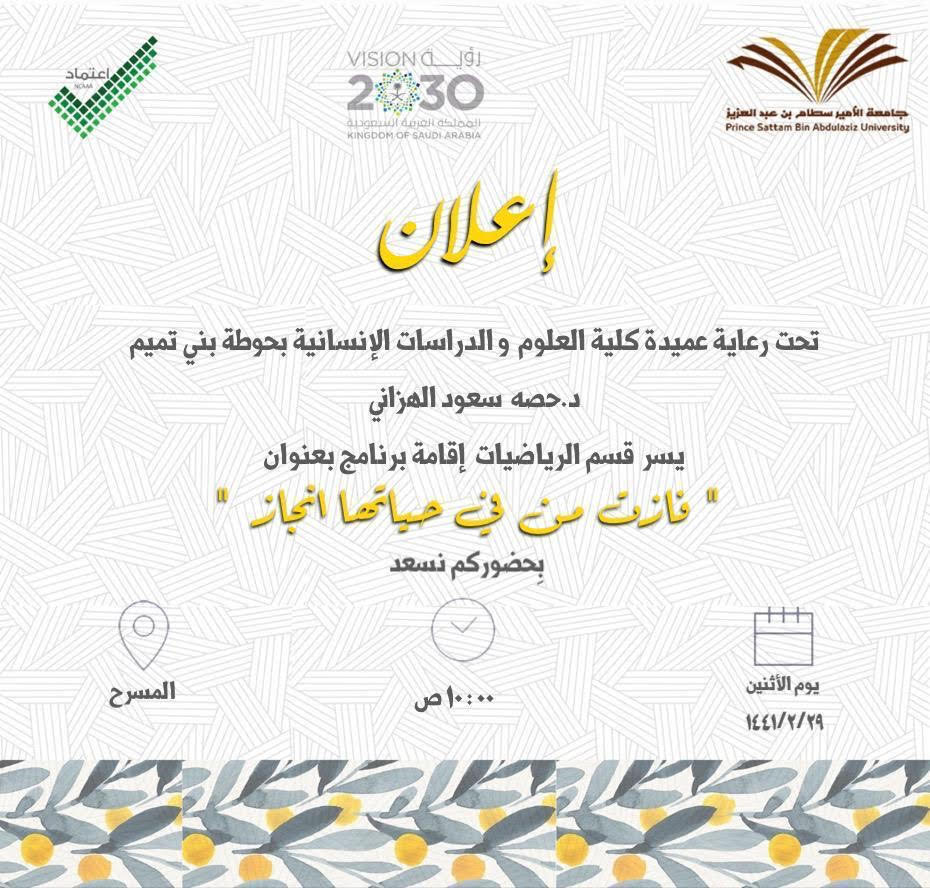 لم يعد يقتصر دور المرأة على الدراسة فحسب بل أنها وصلت إلى الاكتشافات و الاختراعات التي تقدم خدمات للبشرية لا يمكن الاستغناء عنها حتى هذا الوقت، ومن هذا المنطلق وتحت قيادة عميدة كلية العلوم والدراسات الإنسانية بحوطة بني تميم د. حصة بنت سعود الهزاني. قدم قسم الرياضيات برنامج بعنوان:( فازت من في حياتها إنجاز ) تحت اشراف أ. منيرة التميمي وكان ذلك يوم الأربعاء الموافق : ١٤٤١/٢/٢٩ هـ. وتدور محاور البرنامج حول تميز المرأة المنجزة في نفسها وانعكاس تميزها على المجتمع. كما تم عرض بعض النماذج من إنجازات المرأة حول العالم. وكما تم أيضًا توزيع عبارات تحفيزية للحضور لِنشر التفاؤل وعلوّ الهمّة.