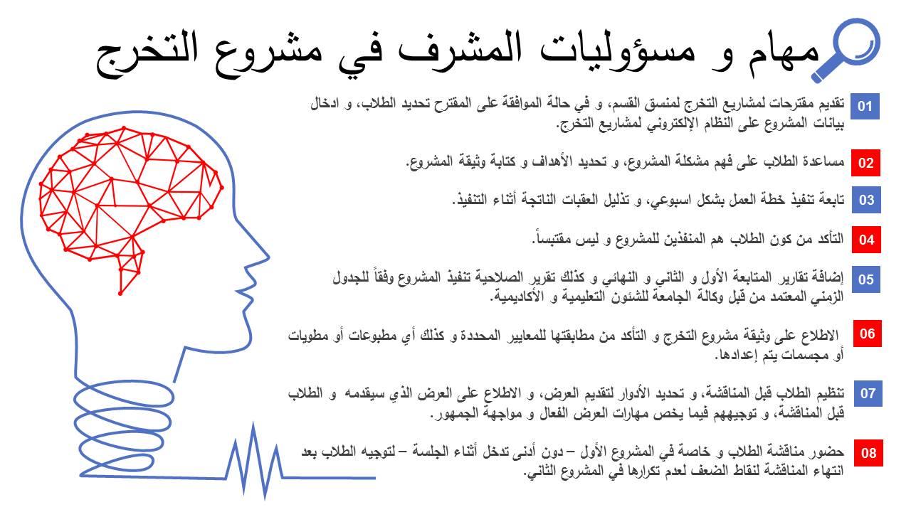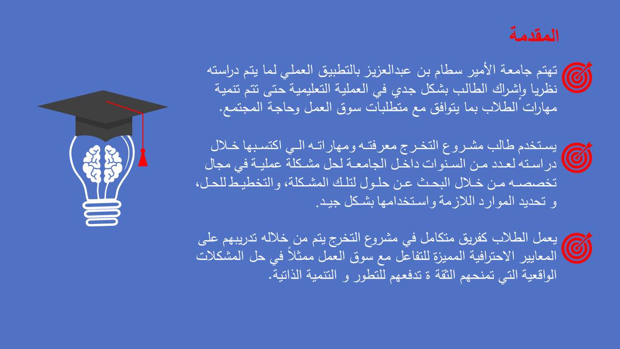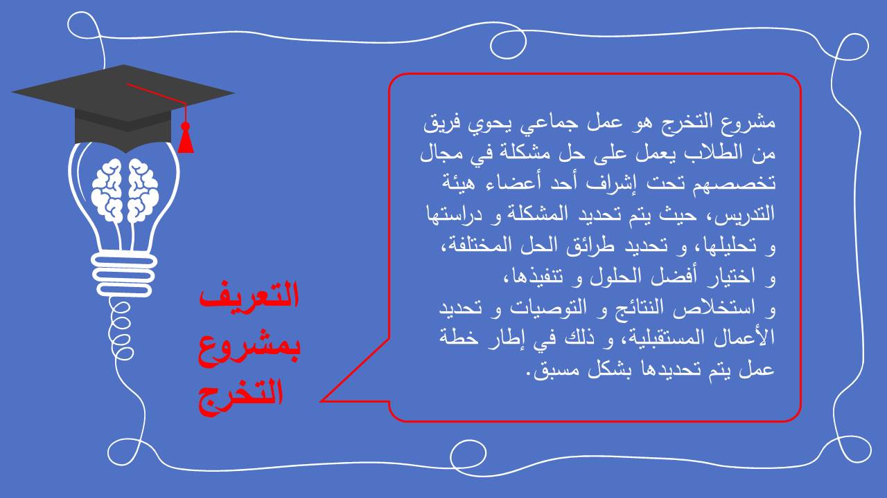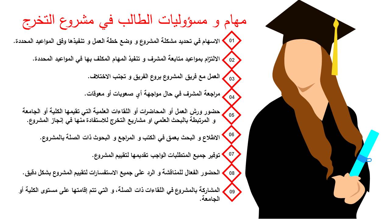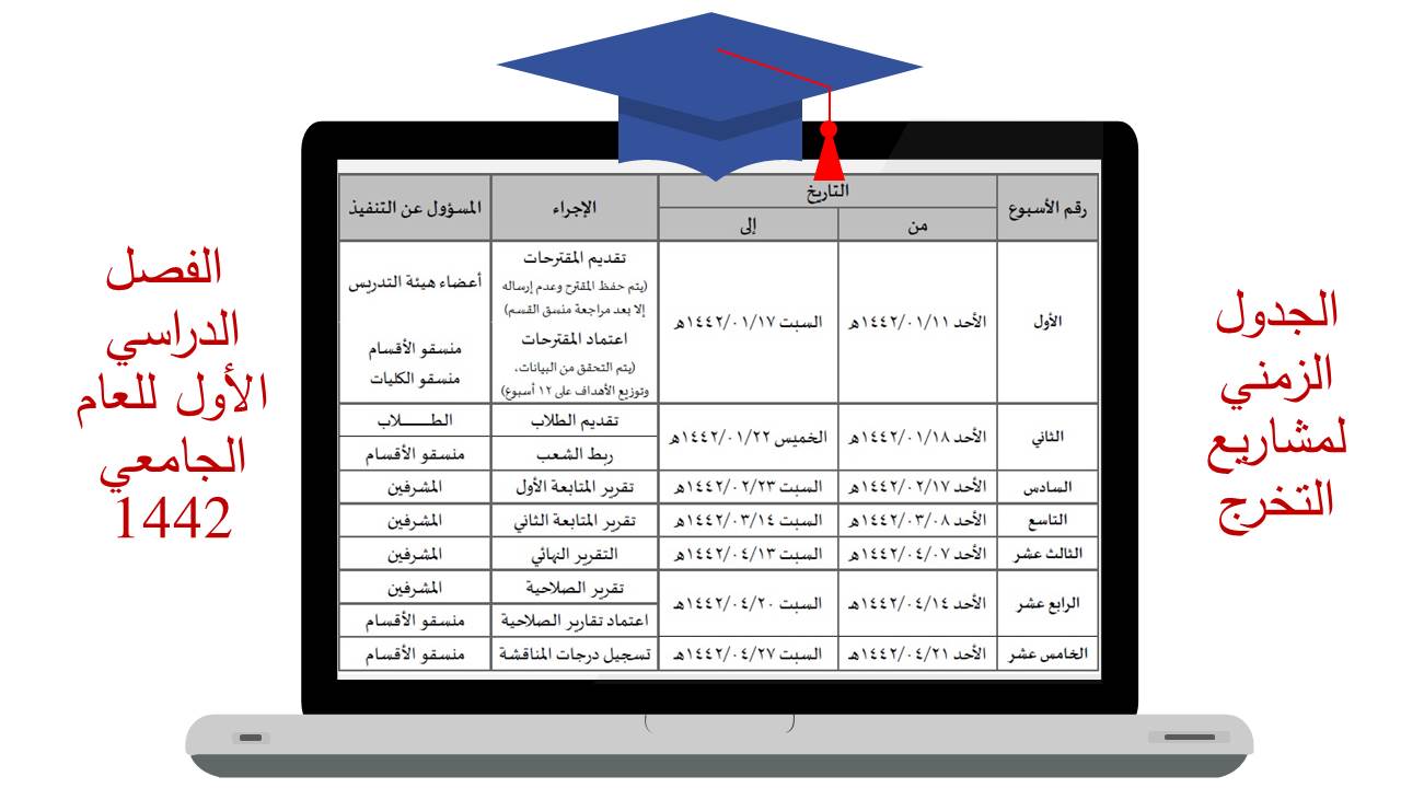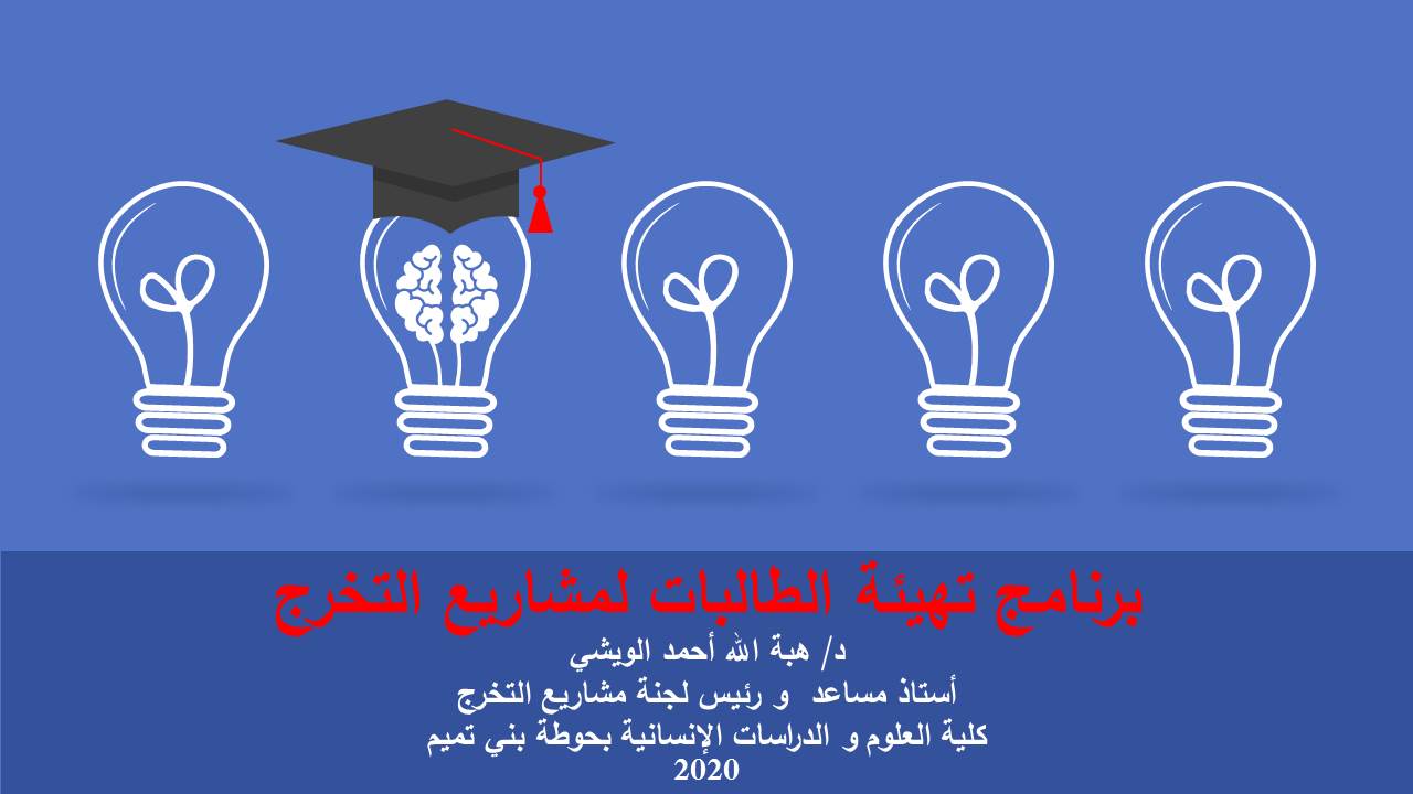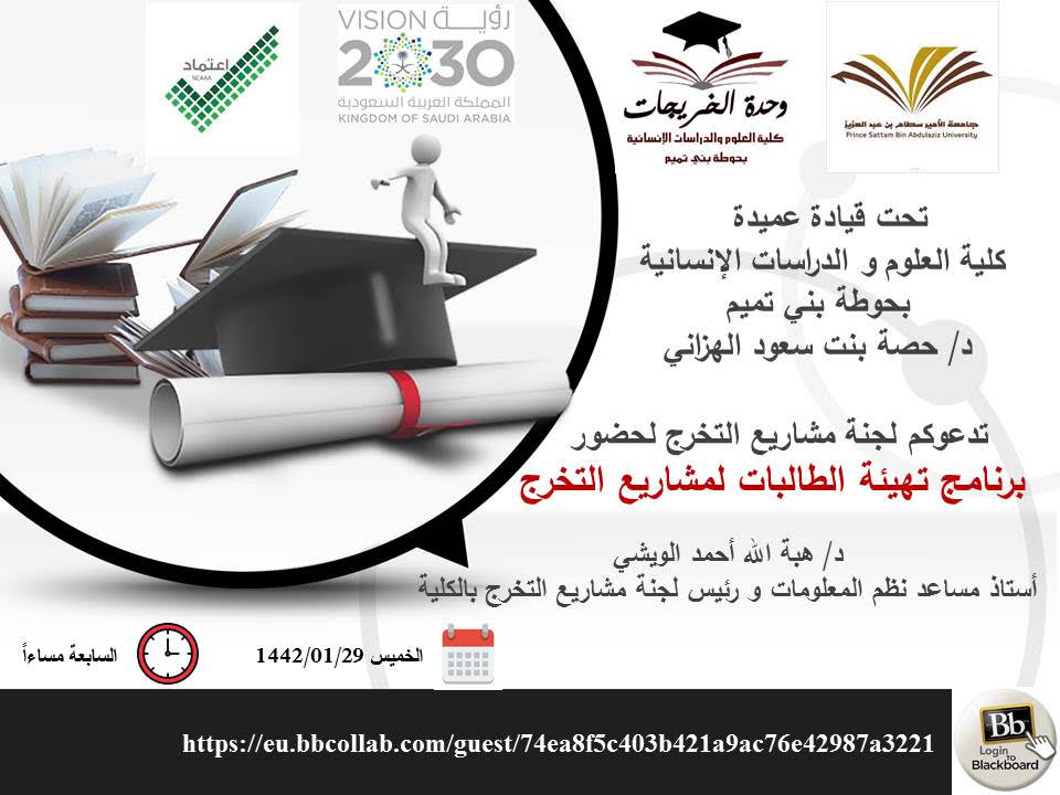 في إطار تهيئة الطالبات و تعريفهن بالإجراءات المنظمة لمشاريع التخرج، قدمت د/ هبة الله أحمد الويشي أستاذ مساعد بقسم نظم المعلومات ورئيس لجنة مشاريع التخرج بالكلية برنامج تهيئة الطالبات لمشاريع التخرج الفصل الدراسي الأول للعام الجامعي 1442هـ. تحت قيادة عميدة كلية العلوم و الدراسات الإنسانية بحوطة بني تميم سعادة د. حصة بنت سعود الهزاني، و ذلك يوم الخميس الموافق: 1442/1/29هـ الساعة السابعة مساءً عبر Blackboard Collaborate. حيث بدأت الجلسة بالترحيب بالحضور الكريم و عددهم 20 ممثلاً في منسقات لجنة مشاريع التخرج و نخبة من عضوات هيئة التدريس المشرفين و طالبات مشاريع التخرج لتعريفهم بمشروع التخرج، وأهدافه، ومهام ومسؤوليات كل من الطالب و المشرف، والجدول الزمني لتنظيم مشاريع التخرج، وآلية تقويم الطلاب وتوزيع الدرجات، وحث الطالبات على حضور ورش العمل أو المحاضرات أو اللقاءات العلمية التي تقيمها الكلية أو الجامعة و المرتبطة بالبحث العلمي أو مشاريع التخرج للاستفادة منها في إنجاز المشروع. كما تم تحفيز الطالبات على المشاركة بالمشروع في اللقاءات ذات الصلة، و التي تتم إقامتها على مستوى الكلية كمسابقات التميز بين الأقسام العلمية أو على مستوى الجامعة و خاصة الملتقى العلمي. واختتمت الجلسة بفتح النقاش و الرد على استفسارات الطالبات.