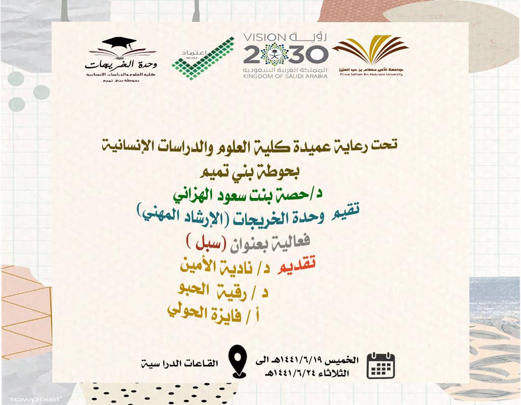 صندوق تنمية الموارد البشرية (هدف) يطلق بوابة التثقيف والإرشاد المهني سُبل لتمكين القوى الوطنية، وحرصاً من عميدة كلية العلوم والدراسات الإنسانية بحوطة بني تميم د. حصة بنت سعود الهزاني على مستقبل الطالبات المهني. أقامت وحدة الخريجات متمثلة بلجنة الإرشاد المهني برنامج تعريفي عن منصة سُبل التابعة لتنمية الموارد البشرية . قدمتها د. ناديه الأمين . وذلك في يوم الخميس الموافق :1441/6/19هـ. في قاعة (16 - 19)بالمبني الأول الدور الثالث. حيث تهدف هذه المنصة (سُبل) إلى توفير بيئة إلكترونية تفاعلية تهتم بالتثقيف والإرشاد المهني مع الشرائح المستهدفة وتمكين الفئات المستهدفة من الاختيار الفعال لمسارات التعليم والعمل. وتناول البرنامج التعريف بالمنصة سُبل وأهدافها والمستفيدين منها والخدمات التي تقدمها.