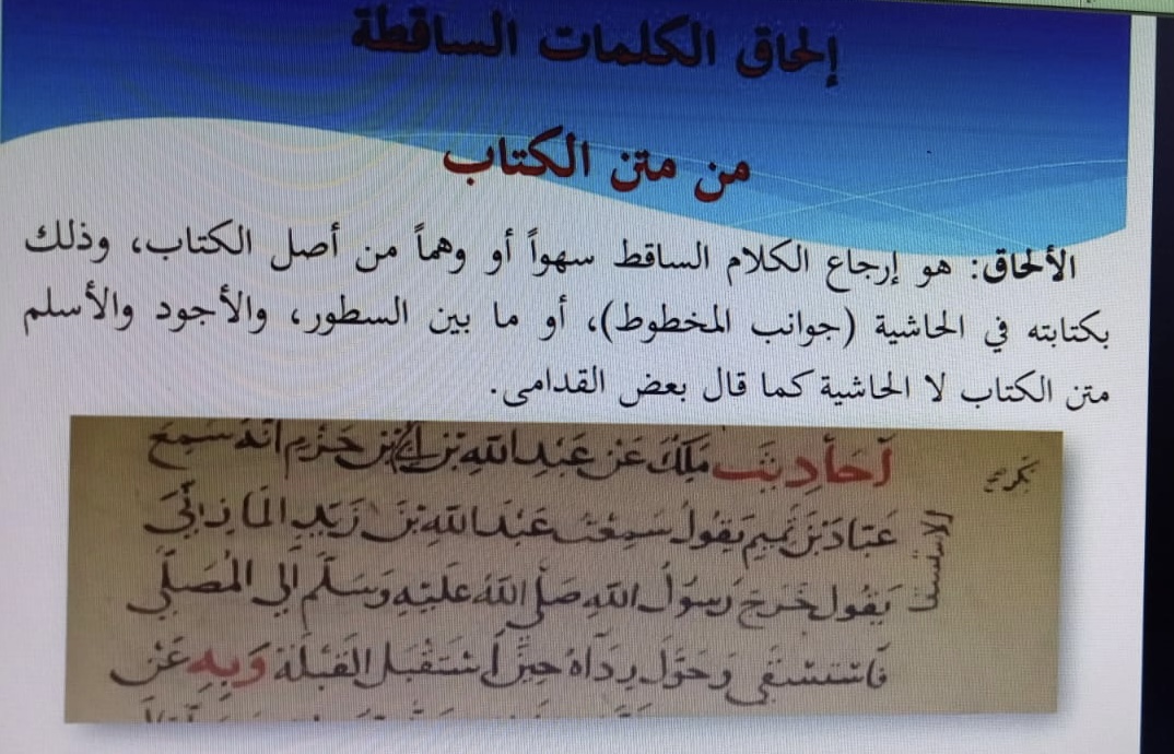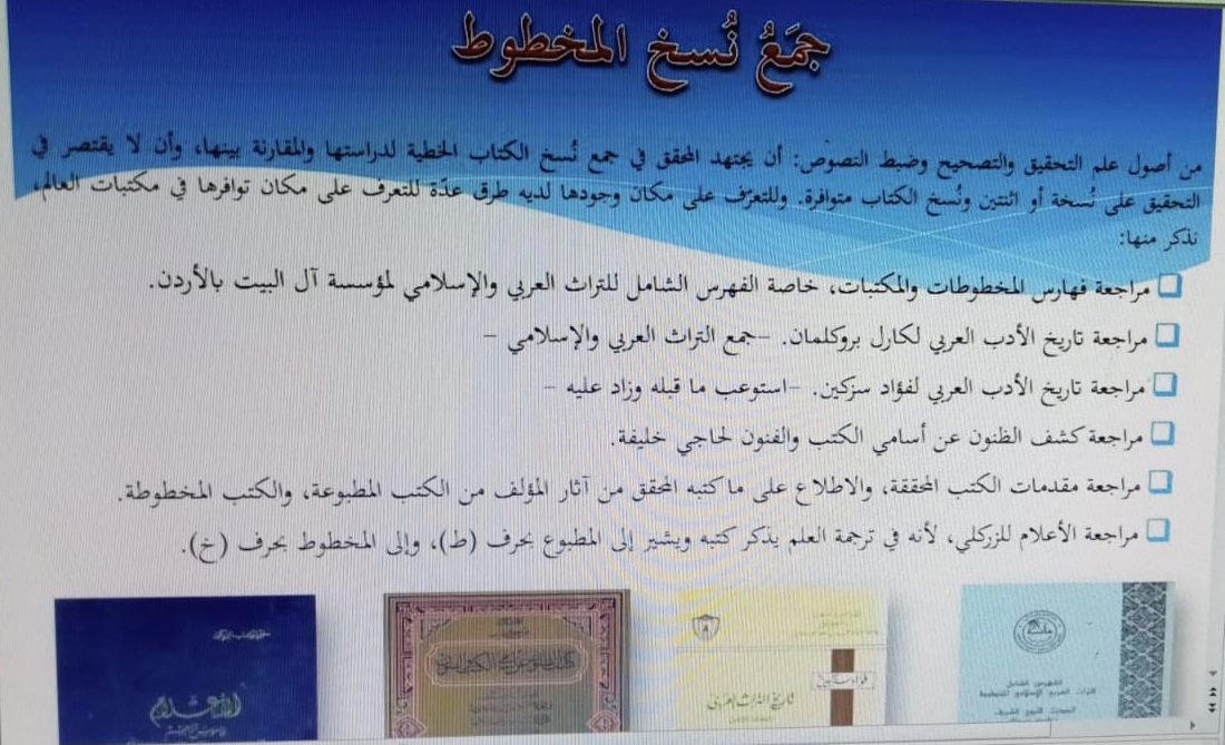 للمخطوطات أهمية كبيرة لأنها تضم علم الأمم والحضارات السابقة، ولا أهميتها قدمت الدكتورة نادية لطفي برنامجاً بعنوان( المخطوطات التعريف والمصادر) تحت رعاية عميدة كلية العلوم والدراسات الإنسانية بحوطة بني تميم د. حصة بنت سعود الهزاني، وبإشراف الدكتورة نحا القحطاني، وذلك في يوم الخميس الموافق: 1442/8/19هـ، الساعة الحادية عشر صباحاً عبر برنامج الزوم، وبحضور سبع عشرة طالبة، حيث قامت بعرض تقديمي تناولت فيه التعريف بمعنى التحقيق وصفات المحقق والمراحل التي يمر بها التحقيق وهي ثلاثة مراحل: