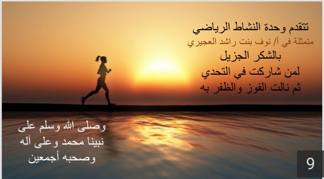 بحضور عددٍ من أعضاء هيئة التدريس والطالبات عبر برنامج البلاك بورد، حيث ابتدأ البرنامج بافتتاحية ، ثم إعلان لأسماء الفائزات بهذا التحدي مع عرض صورة لعدّاد خطوات كل متسابقة على حدة ، ثم إعلان الجوائز المقدمة للفائزات ، واختتم البرنامج بشكر الله عز وجل ثم شكر الحضور على حسن استماعهم .