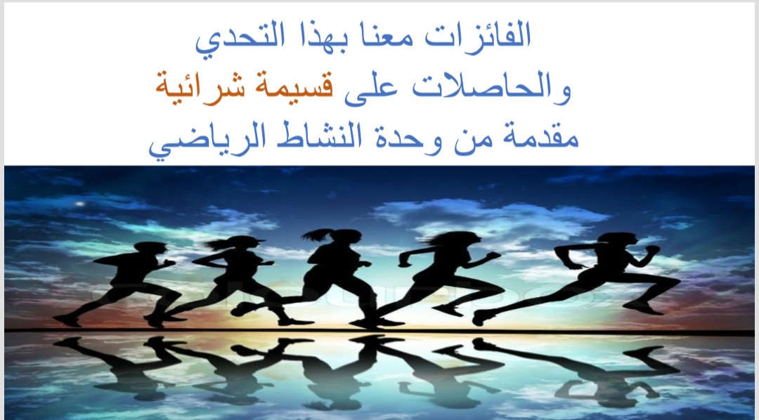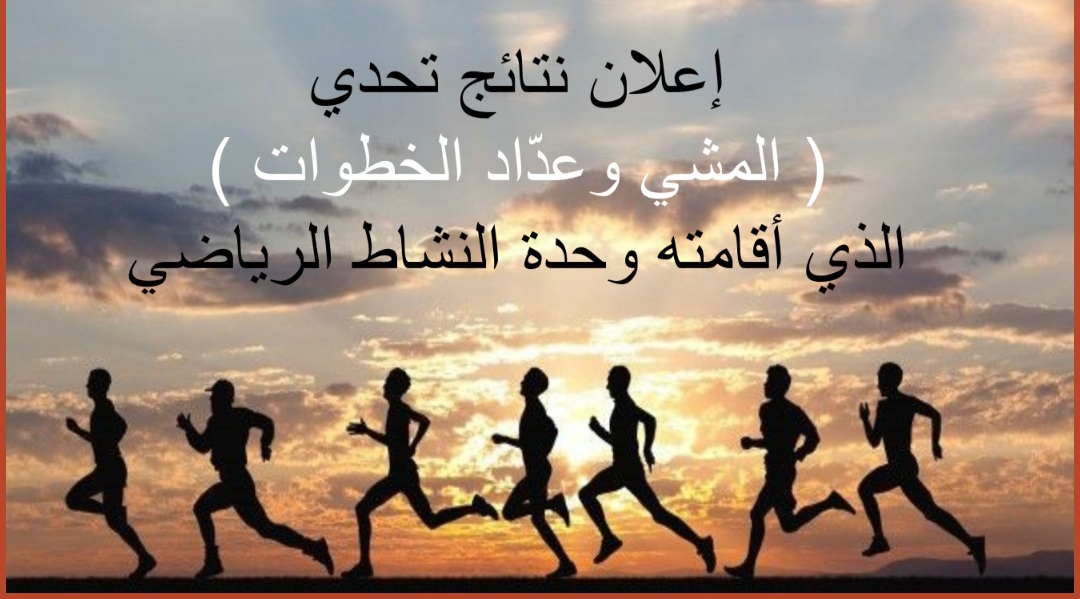 تعد الرّياضة وسيلة للحصول على جسدٍ سليمٍ ومعافى. حيث أقامت وحدة النشاط الرياضي بإشراف من الأستاذة / نوف بنت راشد العجيري برنامجًا بعنوان ( إعلان نتائج تحدي " المشي وعدّاد الخطوات ") تحت رعاية سعادة عميدة كلية العلوم والدراسات الإنسانية بحوطة بني تميم الدكتورة/ حصة بنت سعود الهزاني، وذلك في يوم الأربعاء الموافق: ١٧ / ٤ / ١٤٤٢ هـ، في تمام الساعة السادسة مساءً.