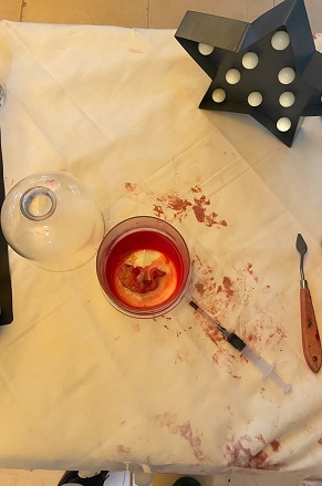- بقع الدم: وهو مزيج ثيوسيانات البوتاسيوم الذي يوضع على جلد الممثل مع نترات الحديد والذي يوضع بدوره على حافة الأداة المستخدمة كالسكين.