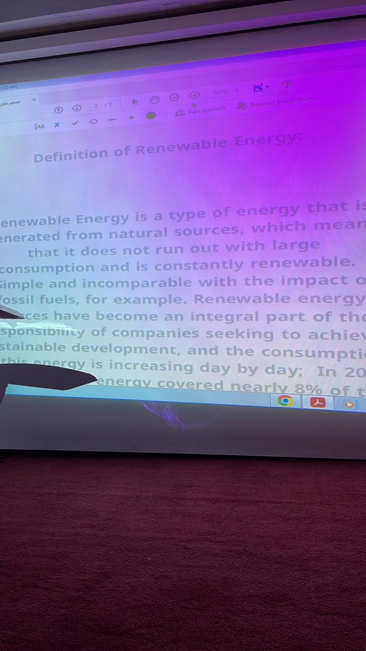 من خلال هذا البرنامج قدمت الطالبات عرض تقديمي للتعريف بالطاقة المتجددة ومزاياها وأنواعها، وإسهامات ومشاريع المملكة في تحقيق التنمية المستدامة بطاقات متجددة آمنة للبيئة مثل: الطاقة الشمسية - طاقة الرياح - الطاقة الكهرومائية - طاقة الهيدروجين- الوقود الحيوي المستدام. كما تم ذكر استخدامات الطاقة المتجددة في المملكة العربية السعودية مثل: مشروع محطة الجبيل ومشروع البحر الأحمر. والاشارة إلى الرقم القياسي العالمي الذي حققته المملكة على مستوى العالم في توليد طاقة الرياح.