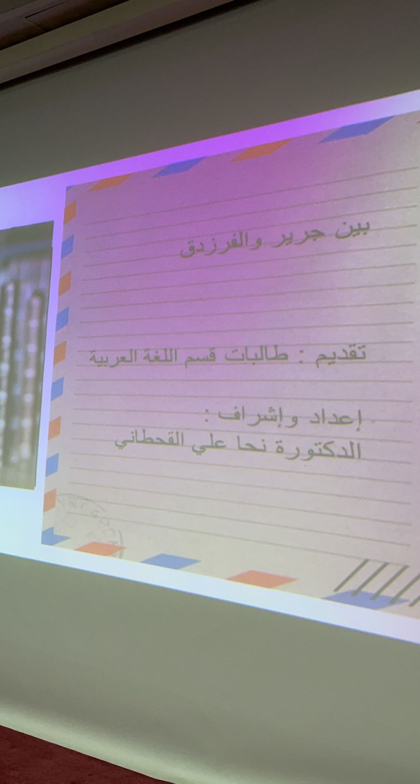 يظل الشاعران جرير والفرزدق رمزاً للمبارزة الشعرية رغم تتابع الزمن، وعلى مسرح كلية العلوم بحوطة بني تميم تحت رعاية عميدة الكلية الدكتورة حصة بنت سعود الهزاني قدمت طالبات قسم اللغة العربية مشهدًا تمثيليًا من إعداد مشرفة النشاط الدكتورة نحا القحطاني بعنوان (بين جرير والفرزدق) في تمام الحادية عشرة من صبيحة الأربعاء ٢٦/ ٦/ ١٤٤٤هـ، كان حوارًا شعريًا بين الشاعرين الفحلين، وقد سبق ذلك عرضًا مرئيًّا لنشأة كل منهما ونسبه وحياته، وعلاقتهما ببعضهما، وأبرز اللقاءات الشعرية بينهما، وقد تخلل ذلك توزيع بعض تقديمات الطالبات التي عرضت لجميل شعرهما وشيء من صفاتهما حتى تجتمع الصورة والذوق في تقديم المعلومة للحاضرات وربط الحاضر بجماليات الشعر القديم في أبهى صوره واستعمالاته.