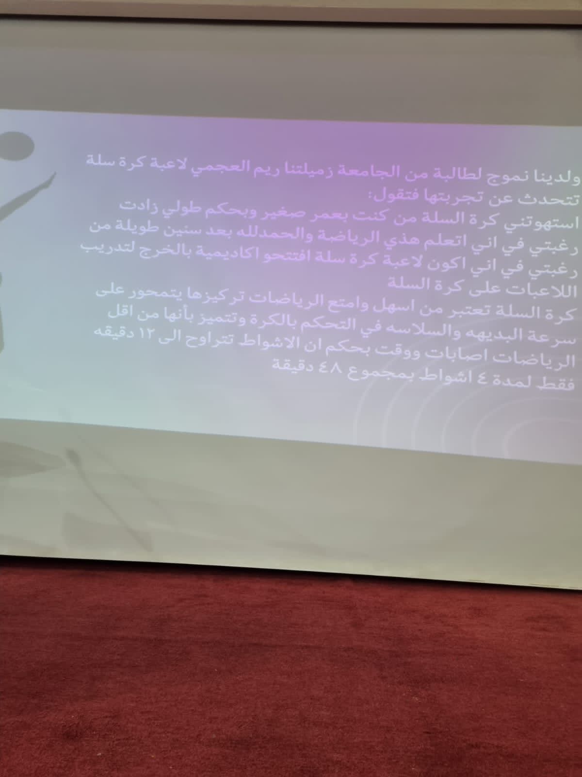 أقام النادي الرياضي في مسرح كلية العلوم والدراسات الإنسانية بحوطة بني تميم برنامجًا بعنوان (لكِ أثر) تحت رعاية عميدة كلية العلوم والدراسات الإنسانية د. حصة بنت سعود الهزاني وبإشراف أ. قوت اليحيى (مشرفة النادي الرياضي في الكلية) وذلك يوم الأحد الموافق 1445/2/25هـ الساعة9:30 صباحًا.