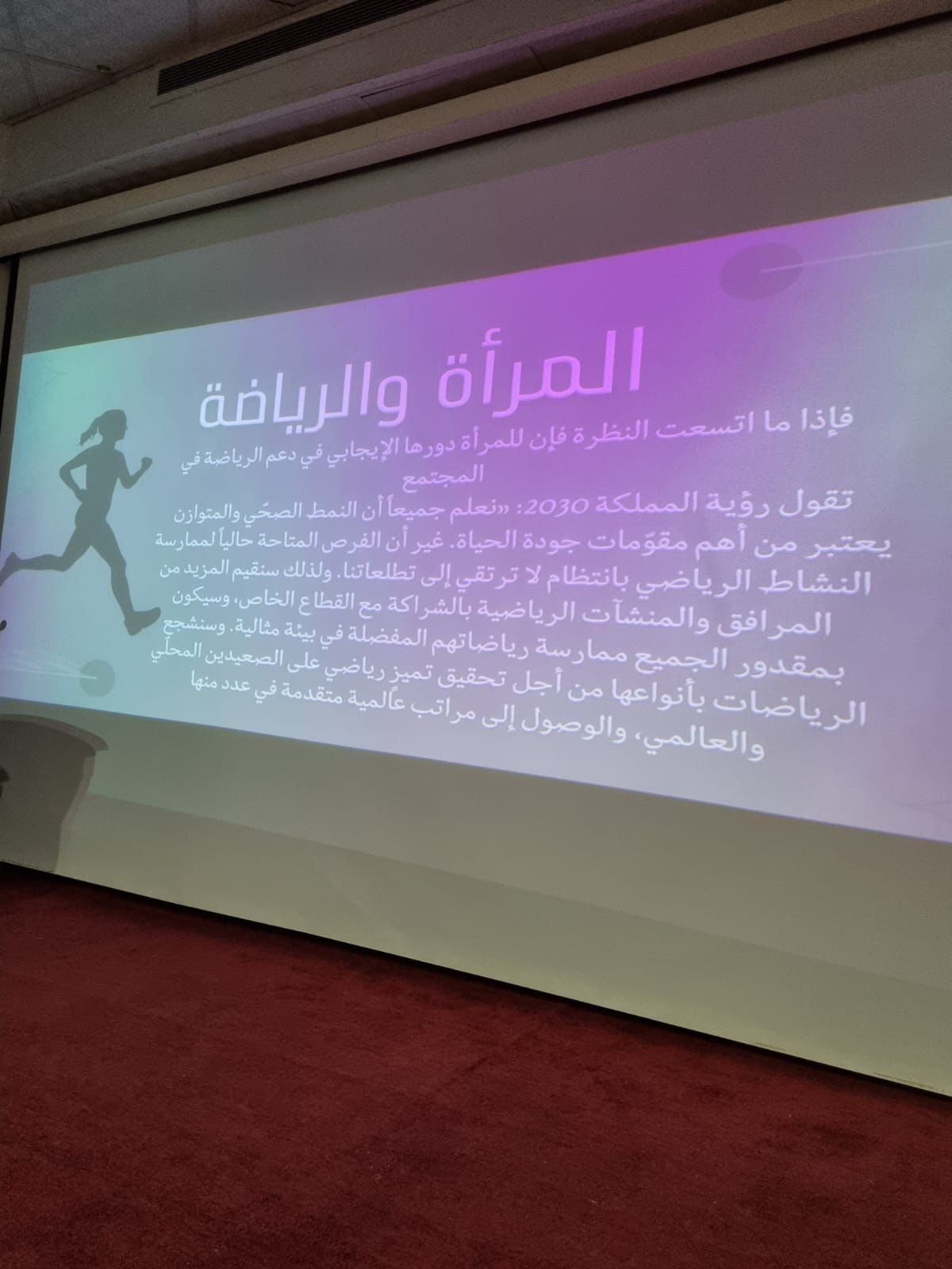 يهدف البرنامج لإبراز دور المرأة الإيجابي في دعم الرياضة في المجتمع، وأهم الرياضات النسائية، بالإضافة إلى عرضٍ لنماذج مشرفة من نساء المجتمع السعودي ساهمن في المجال الرياضي إما إشرافًا أو مشاركةً، وقد حققن العديد من النجاحات على نطاقات دولية، بالإضافة إلى ذلك فقد شارك الحديث طالبات الكلية المهتمات بالرياضة والممارسات لها، وممن حققن بعض النجاحات على مختلف المستويات، كما أجابن على استفسارات الحضور. وكل ذلك يصب في هدف البرنامج لإيقاد جذوة الحماس لدى الطالبات المهتمات بالنشاط الرياضي للتقدم والعطاء والنجاح، ودعم الرياضة في المجتمع في محيطها حيث كان؛ لكونها الجزء الآخر منه.