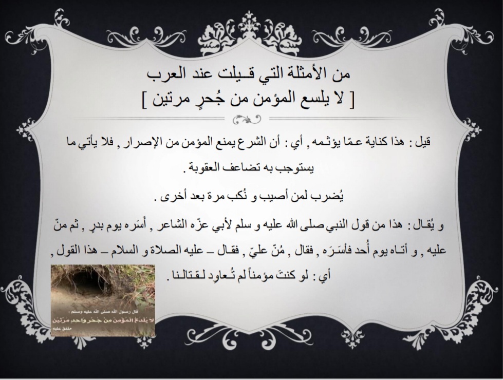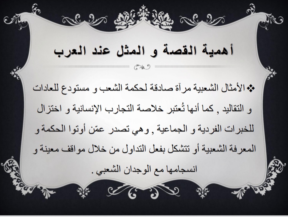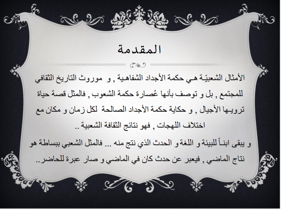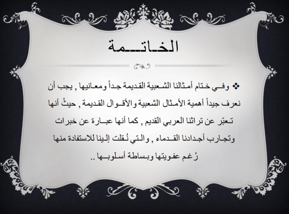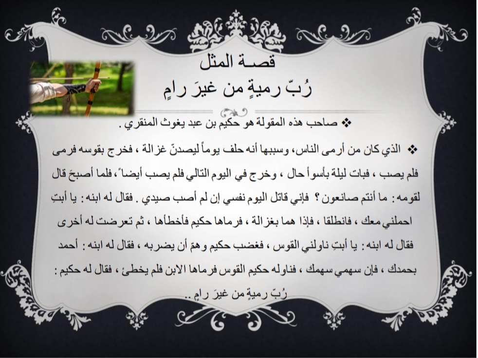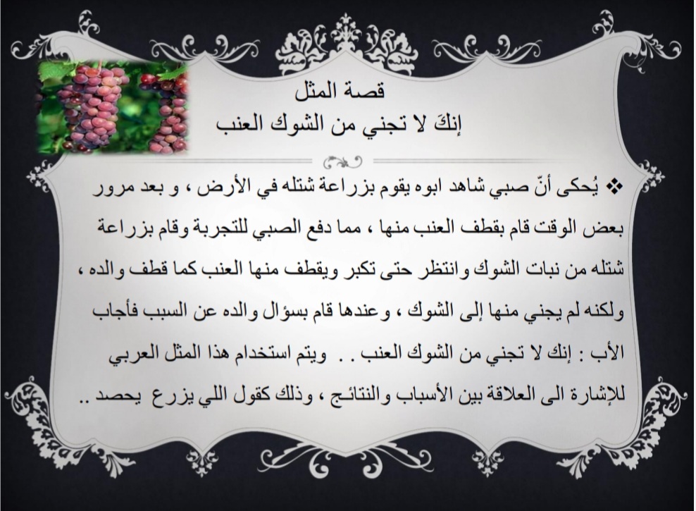 قُدم البرنامج بهدف التعريف بأهمية الأمثال العربية عند العرب كونها نوع فريد من أنواع الفنون، ثم ذكر أبرز الأمثال العربية الشائعة التي قيلت على لسان العرب، مع ذكر قصة كل مثل، واختتم البرنامج بشكر الله عز وجل ثم شكر القائمين على هذا البرنامج - طالبات التربية الميدانية، ثم شكر الحضور على حسن استماعهم.