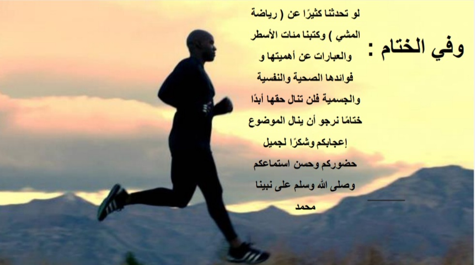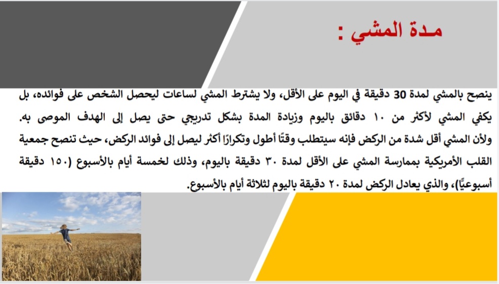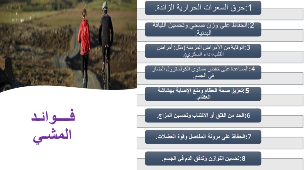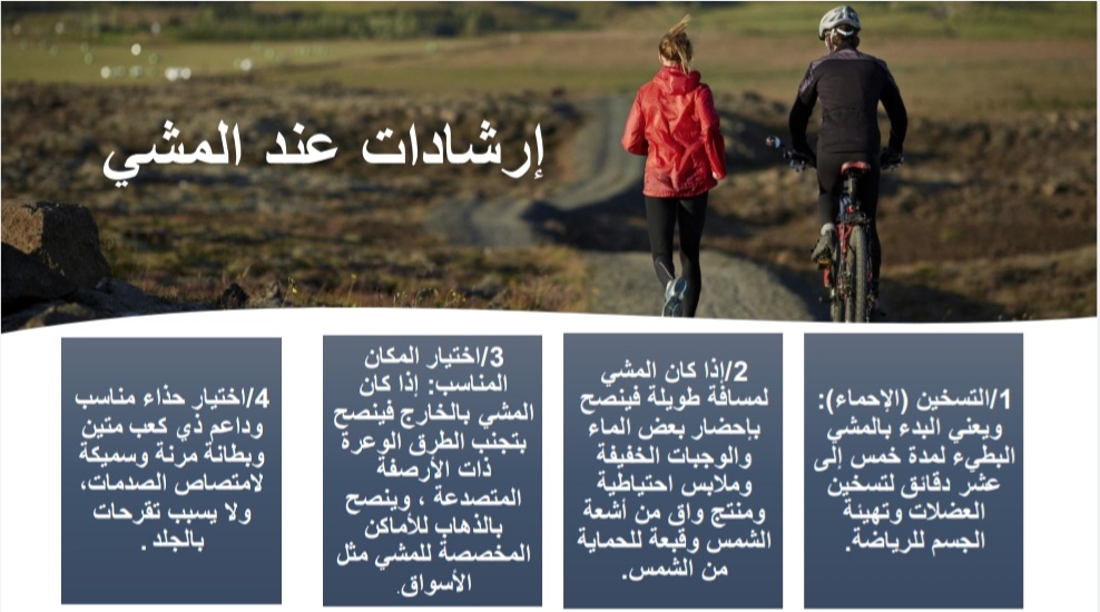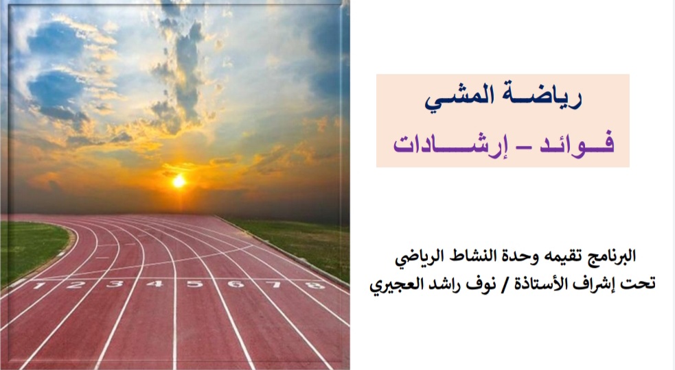 تُعد رياضة المشي من أبسط الأنشطة البدنية التي لا تتطلب أي معدات أو مهارات خاصة. حيث أقامت وحدة النشاط الرياضي بإشراف من أ.نوف بنت راشد العجيري برنامجًا بعنوان (رياضة المشي فوائد + إرشادات ) تحت رعاية سعادة عميدة كلية العلوم والدراسات الإنسانية بحوطة بني تميم الدكتورة/ حصة بنت سعود الهزاني، وذلك في يوم الأربعاء الموافق: ١٠ / ٤ / ١٤٤٢ هـ، في تمام الساعة السادسة مساءً، بحضور عددٍ من أعضاء هيئة التدريس والطالبات. عبر برنامج البلاك بورد.