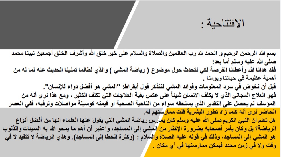 حيث ابتدأ البرنامج بافتتاحية بينت أهمية المشي، يليها ذكر لفوائد المشي، ثم بيان مدة المشي والفرق بينه وبين الجري، بعد ذلك انتقل الحديث إلى بيان طريقة المشي الصحيحة، تلا ذلك ذكر لأهم الإرشادات المهمة التي يجب الأخذ بها عند ممارسة المشي، بعد ذلك تقديم بعض النصائح المحفزة على ممارسة المشي. تم الإعلان عن إقامة الوحدة لتحدي عنوانه ( المشي وعدّاد الخطوات )، واختتم البرنامج بشكر الله عز وجل ثم شكر فريق عمل هذا البرنامج من معدين ومقدمين ثم شكر الحضور على حسن استماعهم.