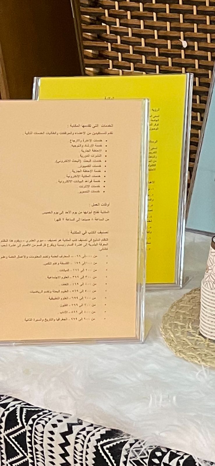 تُعتبر المكتبة من أهم الأماكن التي يقدم من خلالها العديد من الخدمات المعرفية لجميع الطالبات وأعضاء هيئة التدريس، حيث أقامت المكتبة برنامجاً تعريفياً عن المكتبة وخدماتها للطالبات المستجدات بكلية العلوم والدراسات الإنسانية بحوطة بني تميم تحت رعاية عميدة الكلية الدكتورة حصة بنت سعود الهزاني، وذلك يوم الإثنين الموافق:1444/5/11 هـ من الساعة 8 صباحًا إلى الساعة 12 مساءً.