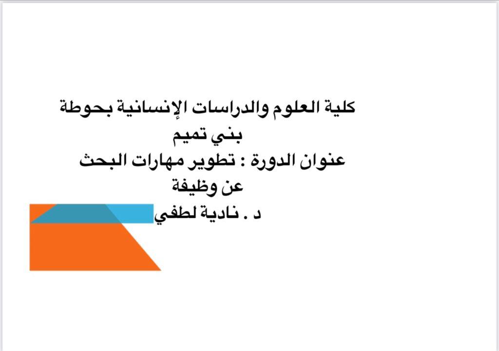 يتطلب البحث عن عمل هذه الأيام مهارات خاصة من أجل الحصول عليه فيجب على الشخص أن يعرف ما الذي يريده، وبناءً على ذلك أقامت لجنة التأهيل الوظيفي بوحدة الخريجات بكلية العلوم والدراسات الإنسانية بحوطة بني تميم تحت رعاية عميدة الكلية د.حصة بنت سعود الهزاني، دورة افتراضية تدريبية بعنوان: "تطوير مهارات البحث عن وظيفة" وذلك في يوم الثلاثاء الموافق: 1442/4/2هـ الساعة الحادية عشر صباحا. عبر برنامج الزووم، قدمتها د.نادية لطفي