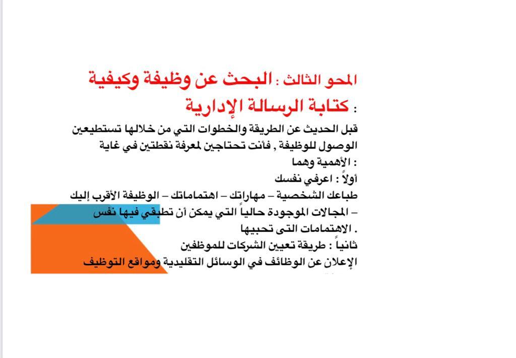 المحور الثالث البحث عن وظيفة من خلال العمل التطوعي أو مقابلات مع متخصصات والمتابعة لما هو جديد وحضور الفعاليات والمناسبات ومواقع التواصل الاجتماعي، وأخيراً كيفية كتابة الرسالة الإدارية.