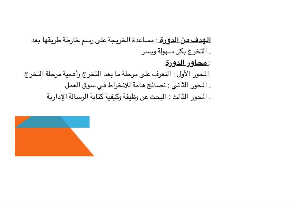 وقد حضر الدورة عددًا من الطالبات الخريجات و المتوقع تخرجهن، حيث بدأت الدورة ببيان الهدف منها وتناولت ثلاثة محاور المحور الأول: التعرف على مرحلة ما بعد التخرج وأهمية مرحلة التخرج من خلال عدة نقاط منها تنظيم صندوق البريد الإلكتروني والاهتمام بالتدريب الوظيفي وتنمية المهارات والذهاب إلى معارض التوظيف والتعمق في دراسة التخصص وتعلم لغة أخرى.
