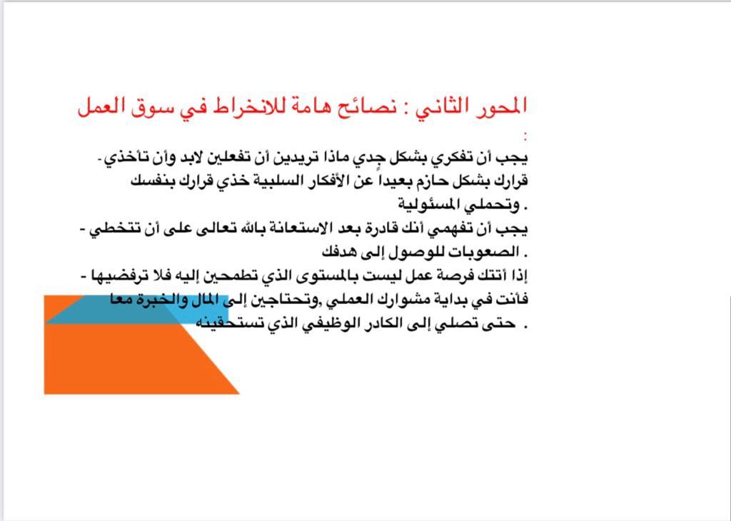المحور الثاني: نصائح هامة للانخراط في سوق العمل حيث تم حث الطالبات على قبول الفرصة الموجودة واعتبارها فترة تدريب لثقل الخبرات واختبار للقدرات في هذا المجال.