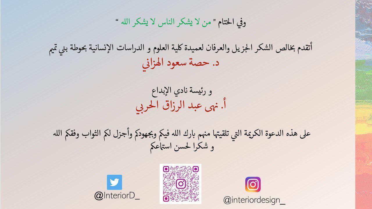 أقام نادي الإبداع بكلية العلوم والدراسات الإنسانية بحوطة بني تميم دورة بعنوان ( أثر الألوان في حياتنا)والتي ألقتها مهندسة الديكور الداخلي أ/ سمر الحربي, تحت رعاية عميدة الكلية د. حصة بنت سعود الهزاني و بإشراف أ/نهى الحربي مشرفة وحدة الإبداع وذلك في يوم الثلاثاء الموافق:1442/2/12هـ عبر برنامج Zoom . حيث تحدثت عن سيكولوجية الألوان وأثرها على النفس البشرية وكيف يتم توظيف الألوان بشكل مناسب في مختلف الأماكن من حولنا، وقامت بتوضيح الألوان المناسبة للطالبات لاستخدامها في مكان الدراسة والراحة مما يضمن لهن مستوى تحصيل أعلى بفضل أثر تلك الألوان. وفي ختام الدورة أجابت على استفسارات الطالبات فيما يخص ذلك واختتمت اللقاء بشكر النادي على الاستضافة وحث الطالبات على البحث عن موضوع الألوان وماله من أثر على نفسية الأشخاص. وقد حضر هذه الدورة عدد من أعضاء هيئة التدريس وعلى رأسهن وكيلة كلية العلوم والدراسات الإنسانية بحوطة بني تميم الدكتورة الفاضلة مي مصطفى وعدد من الطالبات.