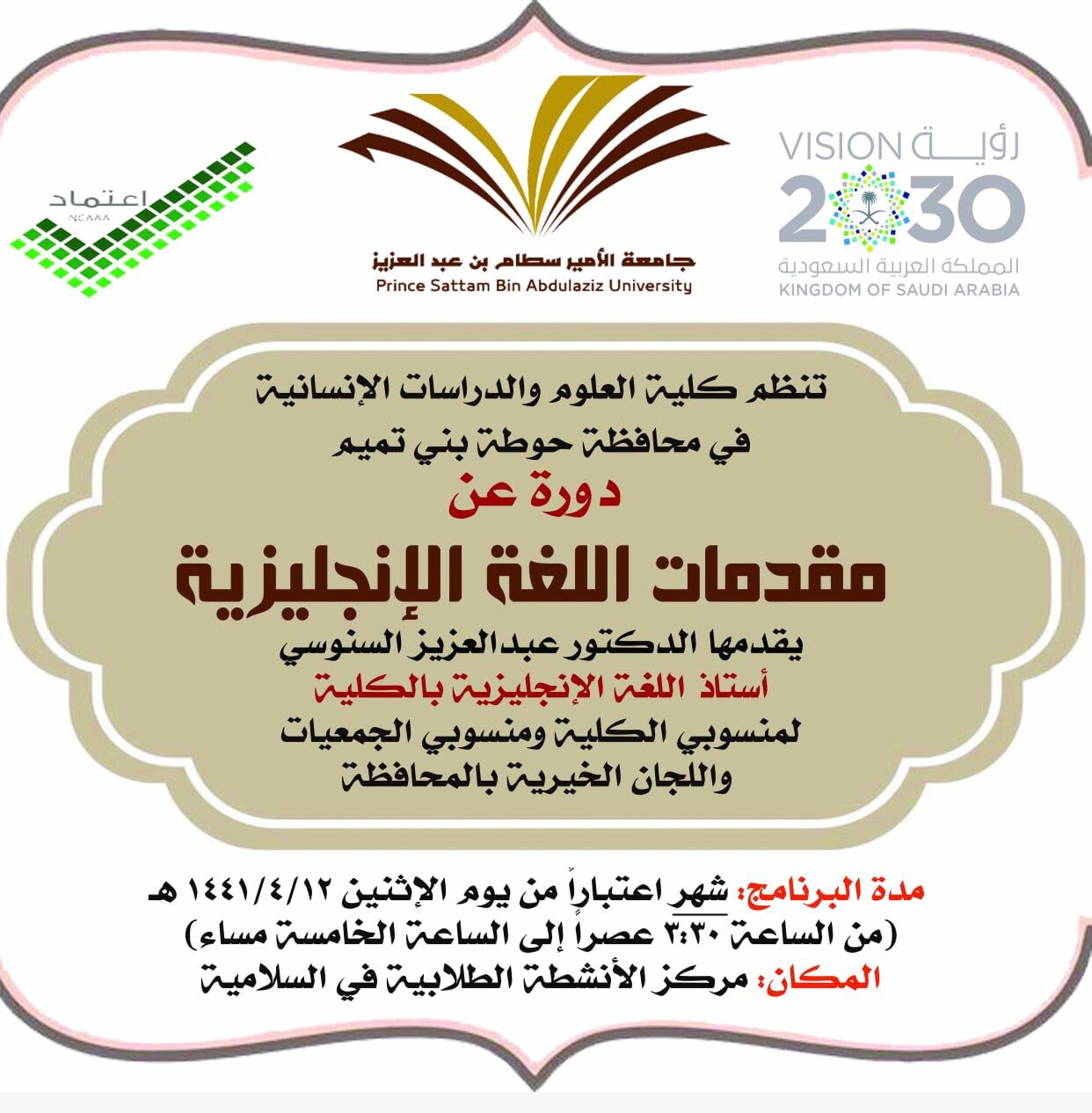 انطلقت مساء أمس الإثنين الموافق:1441/4/12هـ. دورة بعنوان (مقدمات اللغة الإنجليزية) بقاعة مركز الأنشطة الطلابية في السلامية، من الساعة 2:30 عصراً إلى الساعة الخامسة مساءً، والتي تقيمها الكلية كجزء من برامج خدمة المجتمع. تحت قيادة عميدة كلية العلوم والدراسات الإنسانية بحوطة بني تميم الدكتورة/ حصة بنت سعود الهزاني وبإشراف الدكتور/ عبدالله الحبجر مشرف القسم الرجالي بالكلية، ويقدمها الدكتور/ عبد العزيز السنوسي أستاذ اللغة الإنجليزية بالكلية. وتستهدف الدورة التي تستمر لمدة شهر منسوبي الكلية (رجال)، ومنسوبي الجمعيات واللجان الخيرية بالمحافظة. كما تهدف بشكل أساسي لتنمية مهارات المخاطبة ورفع ذخيرة المفردات، وتمكين المتدربين من استخدام مختلف وسائل التعلم الذاتي للغة الإنجليزية.