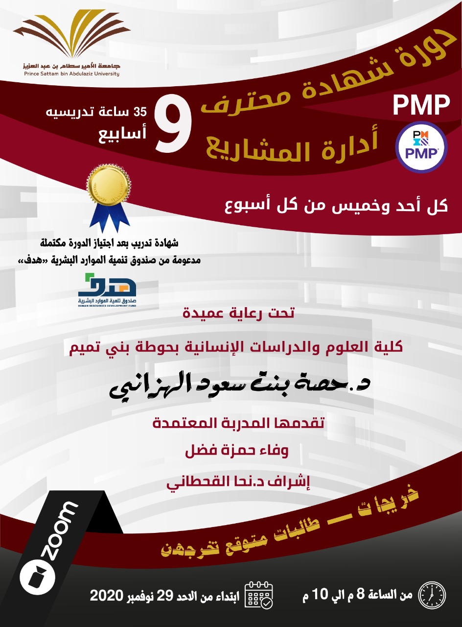 تُساهم إدارة المشاريع في تحويل الأفكار إلى واقع عملي، حيث اهتمت وحدة الخريجات متمثلة بلجنة تنمية المهارات المهنية بإشراف الدكتورة نحا القحطاني بتدريب طالبات كلية العلوم والدراسات الإنسانية بحوطة بني تميم على دورة (شهادة محترف إدارة المشاريع) تحت رعاية عميدة الكلية سعادة الدكتورة حصة بنت سعود الهزاني، ومن تقديم أ. وفاء حمزة فضل، وكانت الدورة لمدة 9 أسابيع من تاريخ 14/ 04/ 1442 وحتى 17/ 08/ 1442هـ.