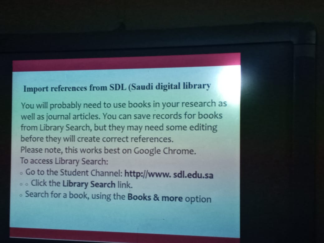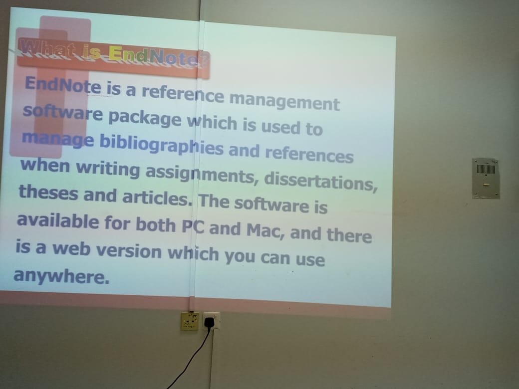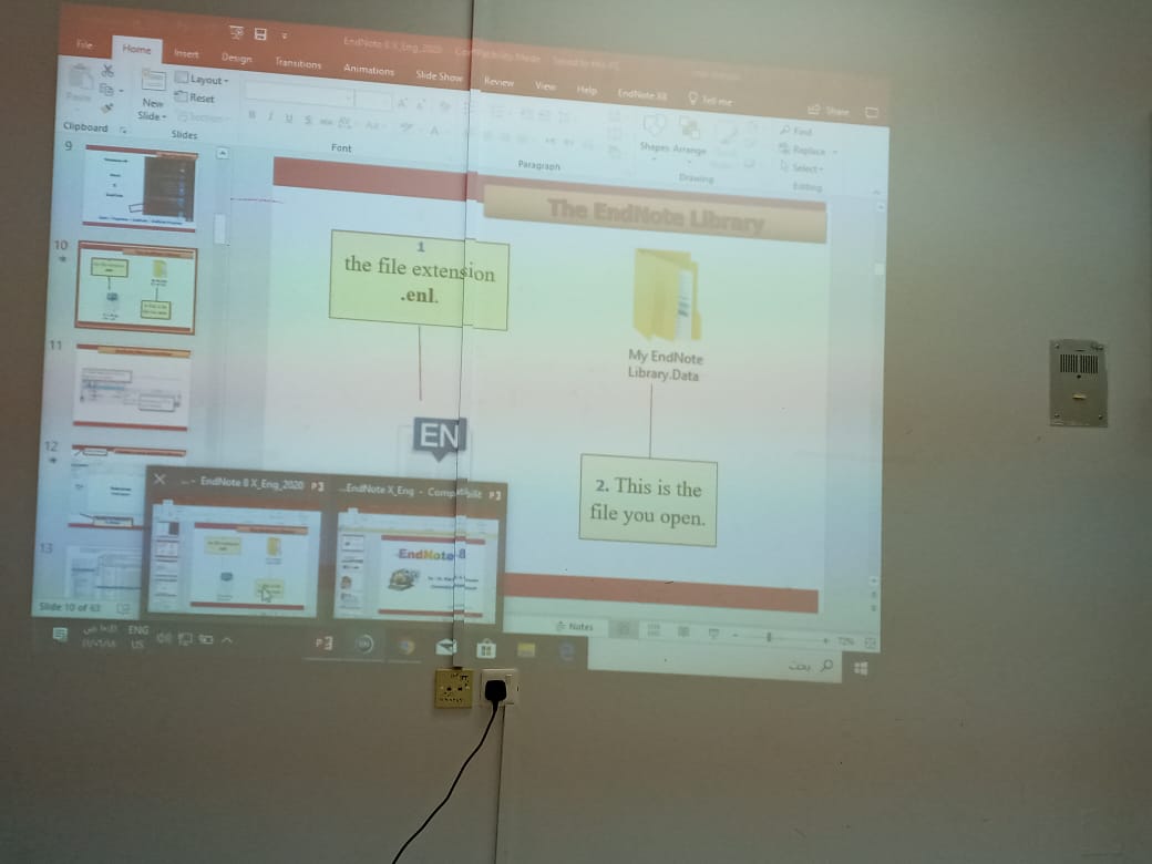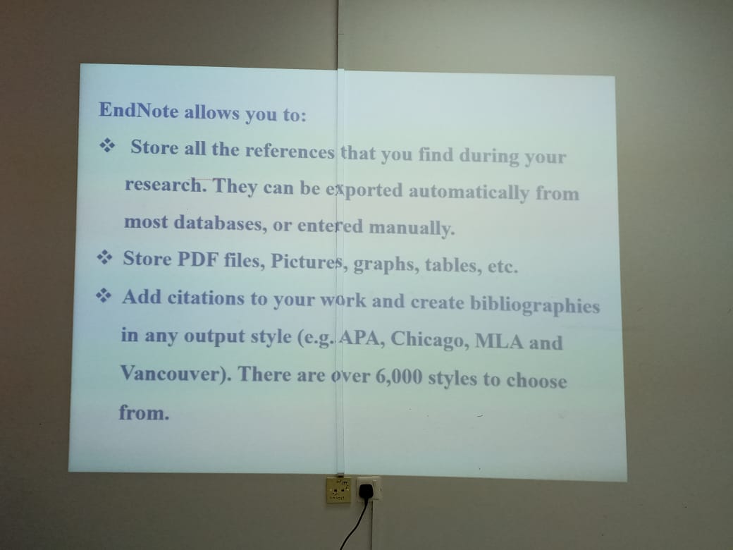 تضمنت الدورة عدة محاور وهي: مقدمة تعريفية: ما هو برنامج (Endnote ): وهو برنامج يساعد علي البحث عن المراجع وتنظيمها و وتوثيقها في برامج الكتابة word و من خلال الخصائص التي يتيحها وهي : إنشاء مكتبات خاصة لمراجعك - إدراج المراجع الي مكتبة Endnote بعدة طرق منها استخدام قواعد البيانات في المكتبة الرقمية السعودية - البحث عن ملفات النص الكامل للمراجع المتوفرة في المكتبة - تنظيم المكتبات الخاصة باستخدام المجموعات وتصنيفها حسب الموضوع أو الكاتب أو غيره - إضافة هذه المراجع في برامج التحرير Word Processor وتوثيقها آليا وإنشاء قائمة مراجع متعلقة بها حسب طريقة التوثيق التي ترغب بها ( يدعم 6000 طريقة توثيق ) - إمكانية تزامن المكتبات عبر أجهزة متعددة . واختتمت الدورة بكلمة مشرفة لجنة البحث العلمي ووجهت الشكر والتقدير لسعادة عميدة الكلية علي رعايتها لهذه الدورة، كما توجهت بالشكر والتقدير لسعادة الدكتورة / مي مصطفى على جهدها المتميز في إقامة الدورة، كما توجهت بالشكر والتقدير للزميلات الحضور من أعضاء هيئة التدريس.
