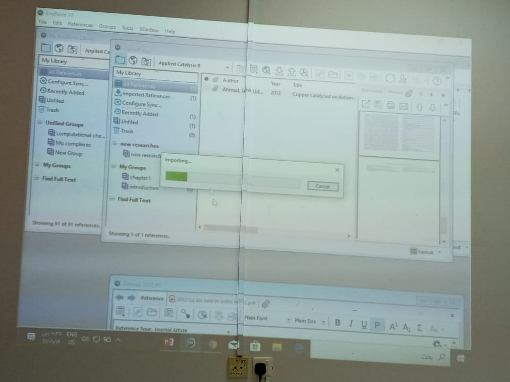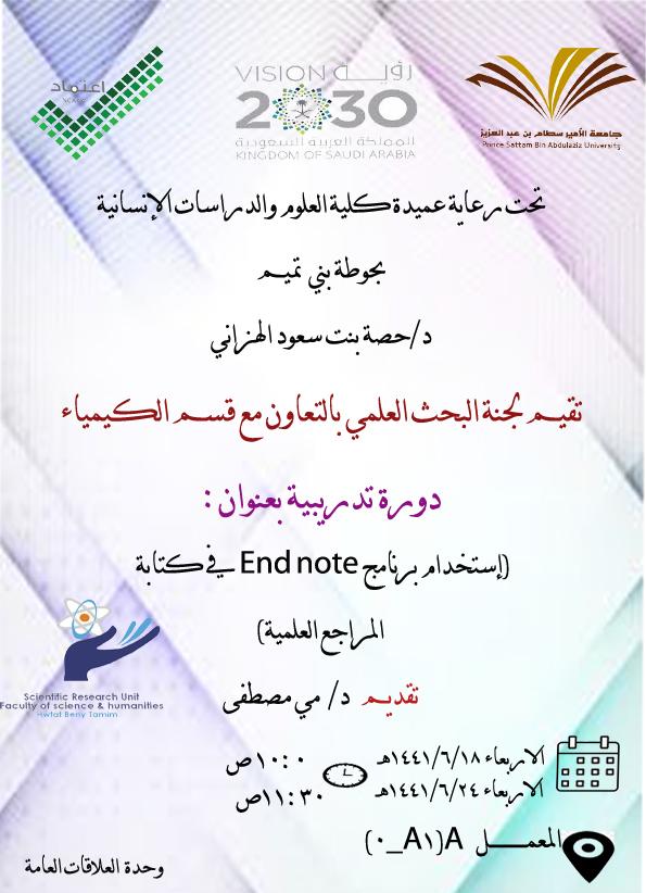 نظمت لجنة البحث العلمي بالتعاون مع قسم الكيمياء تحت قيادة عميدة كلية العلوم والدراسات الإنسانية د/حصة بنت سعود الهزاني، دورة تدريبية بعنوان ( استخدام برنامج الـ EndNote في كتابة المراجع العلمية ). وذلك في يومي الأربعاء( 6/18 _6/25) بمعمل الحاسب بالدور الارضي، وقاعة الاجتماعات بالدور الثاني في تمام الساعة العاشرة صباحاً. من تقديم د/ مي مصطفى أستاذ مساعد بقسم الكيمياء و مساعدة عميدة الكلية للشئون التعليمية والأكاديمية.