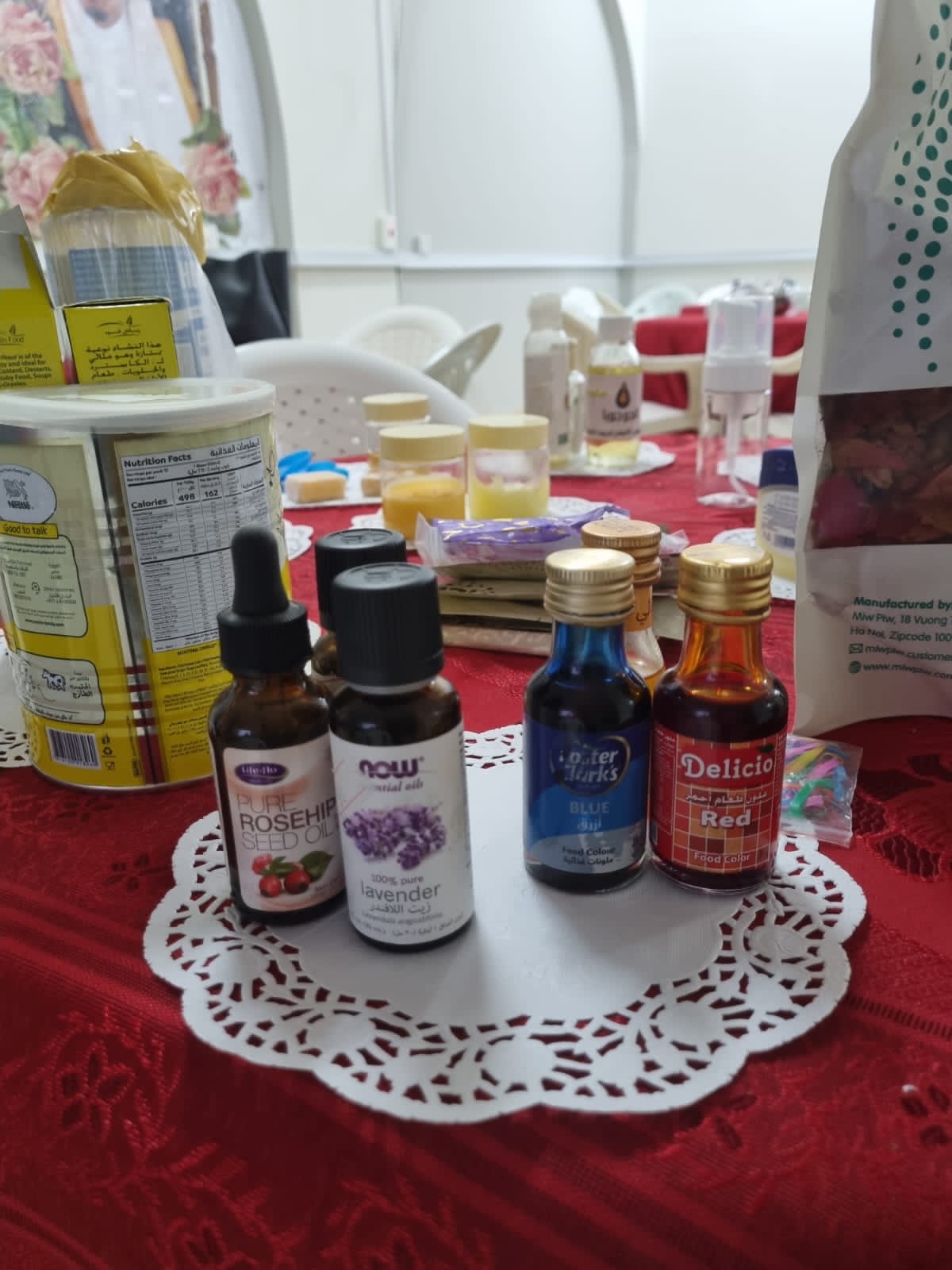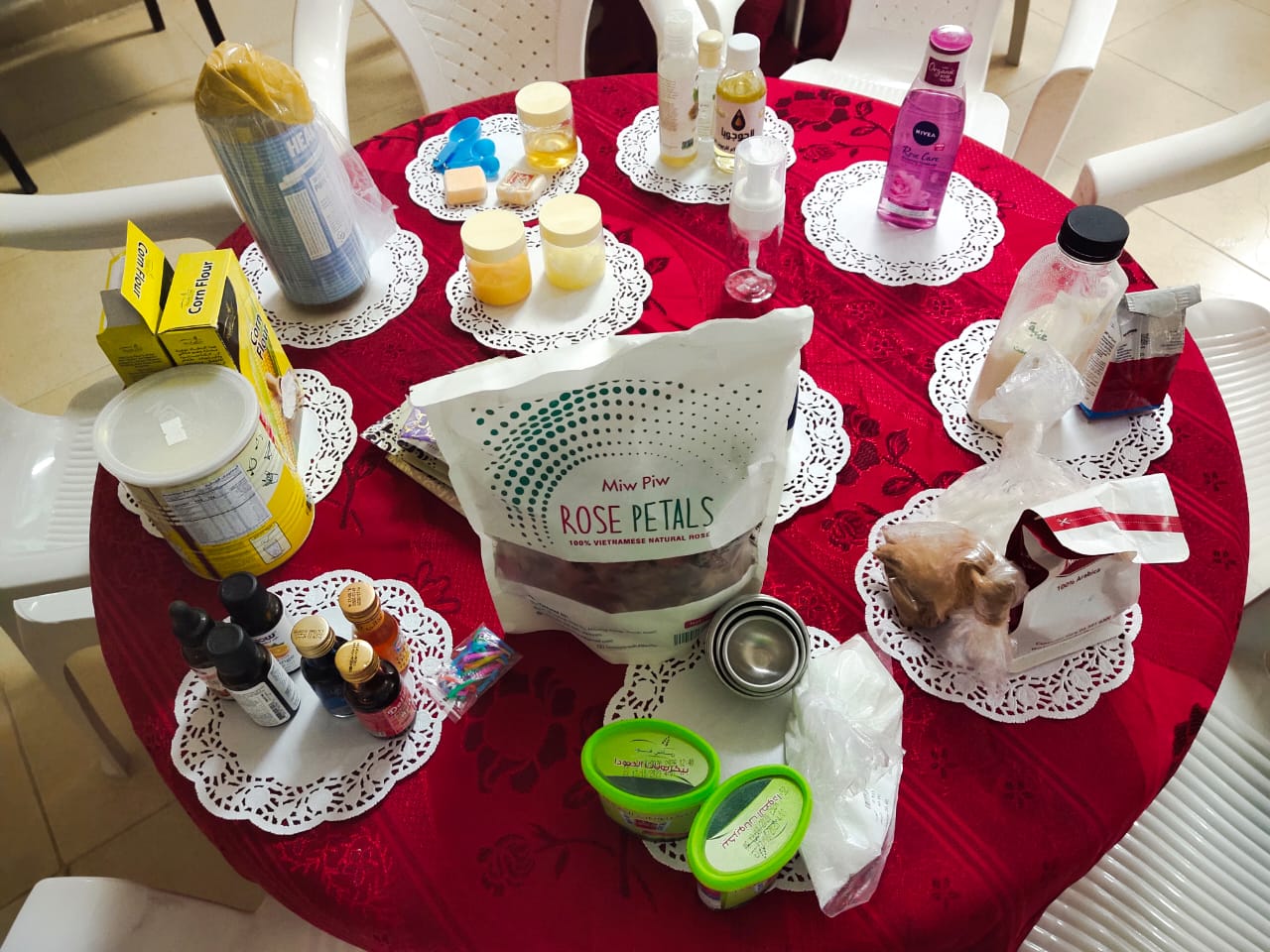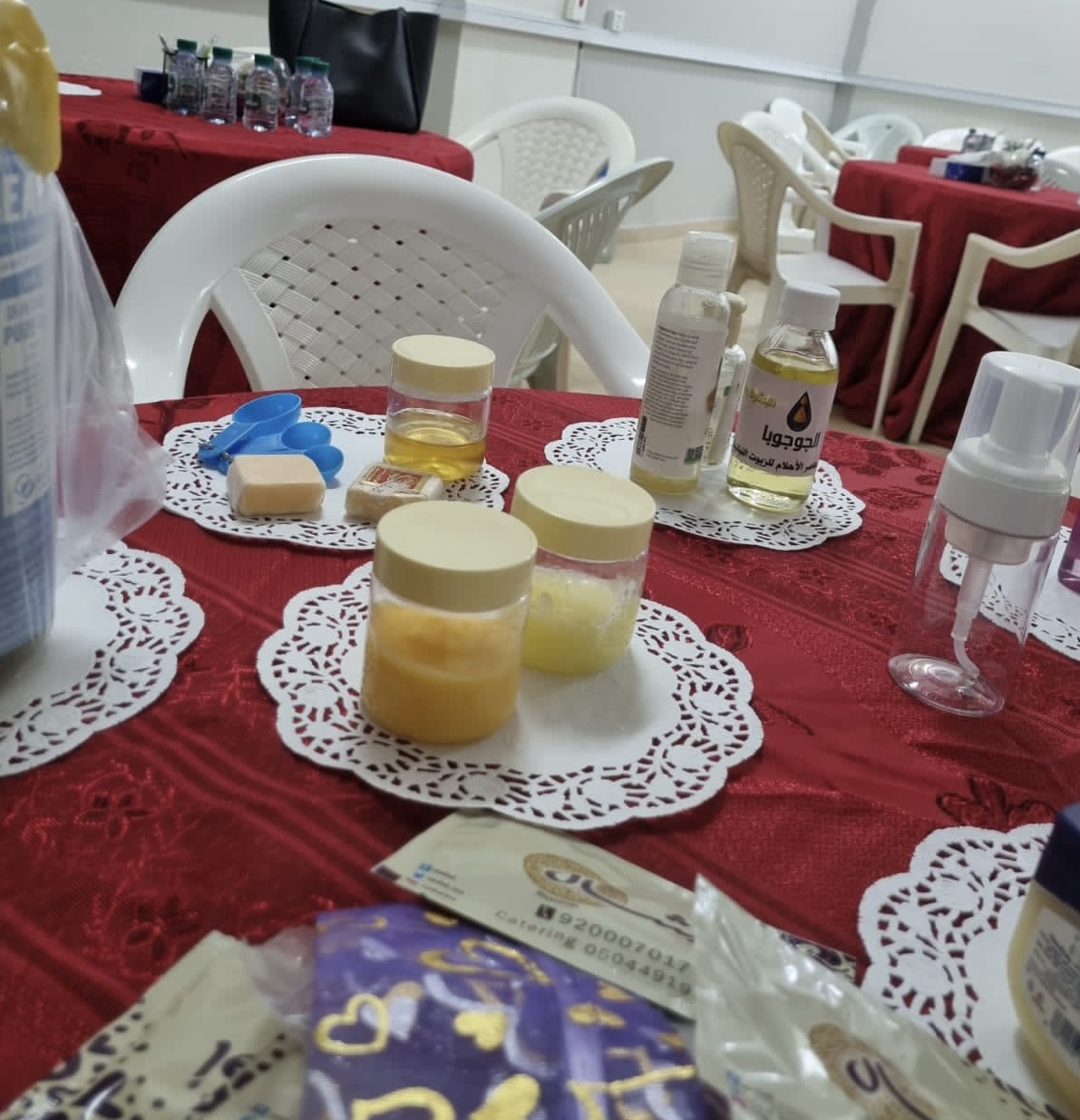 تلا ذلك الجانب التطبيقي العملي بمشاركة الحضور وهو عمل مقشر ومفتح للبشرة، وغسول الوجه الرغوي، وخمرية مرطبة للبشرة والشعر، وكرات الاستحمام، أيضا عمل قناع لإخفاء التجاعيد وتفتيح وترطيب البشرة. وفي ختام الدورة تم توزيع عينات من انتاج المتدربات، وقد نالت الدورة على استحسان الحضور.