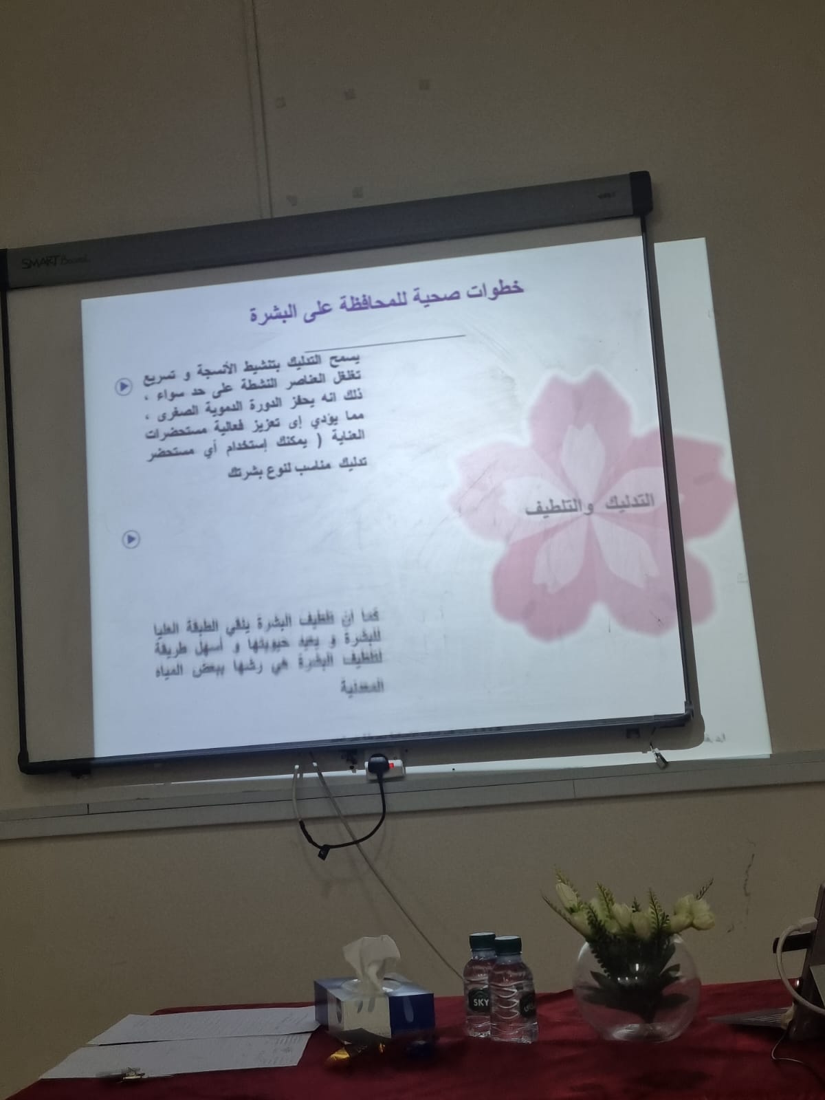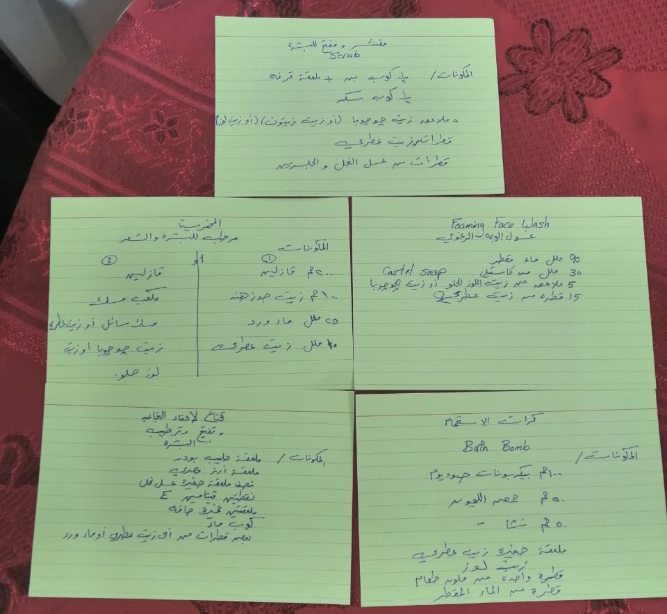 بدأت الدورة بالجزء النظري وهو شرح بعض النقاط المهمة لاكتساب بشرة صحية كتوضيح اختلاف نسبة إفراز الدهون من شخص إلى آخر بالنظر إلى عدة عوامل منها العوامل الوراثية والبيئية المحيطة بنا كاختلاف درجة الحرارة، وسوء التغذية وعدم الاهتمام بشرب المياه، وكثرة استخدام مساحيق التجميل. كما تطرقت إلى ذكر أنواع الأقنعة الطبيعية للبشرة مثل قناع للبشرة الجافة، قناع للبشرة الدهنية، قناع للبشرة المختلطة وقناع لإزالة النمش وإزالة الهالات السوداء حول العينين، كما تحدثت عن طرق اختيار العطور.