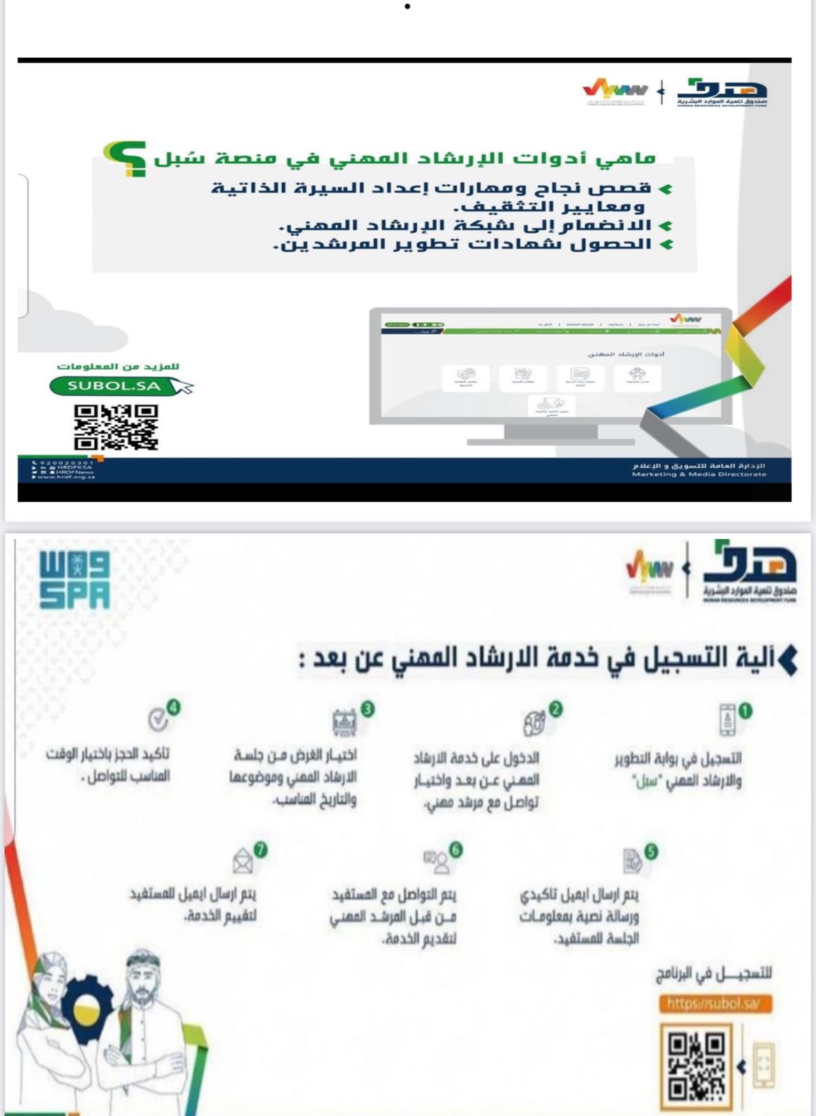 في وقتنا الحاضر وعصرنا المتسارع تظهر مجموعة من التطورات المختلفة التي تساعد الطلبة الأكاديميين في الإبحار إلى عالم المعرفة للوصول إلى أهدافهم بدقة وذكاء، ولكي يصلون إلى أهدافهم بطرق صحيحة لابد من وجود موجه أو مرشد ينور لهم الطريق، ولأهمية ذلك، وتحت رعاية عميدة كلية العلوم والدراسات الإنسانية بحوطة بني تميم د. حصة بنت سعود الهزاني قدمت لجنة الإرشاد المهني التابعة لوحدة الخريجات تحت إشراف أ. ريم الحضيف دورة تدريبية بعنوان: التعريف بمنصة سبل، تقديم أ. فايزة سالم الحولي وذلك في يوم الأربعاء الموافق ١٤٤٣/٧/٢٩ هـ الساعة ٧:٠٠ مساءً على نظام البلاك بورد، وهدفت هذه الدورة إلى تعريف الطالبات بالبوابة الإلكترونية سبل وطريقة التسجيل فيها لكي يتمكنوا من معرفة ميولهم المهنية والأكاديمية ومعرفة أهم المهن المستقبلية ونبذة عنها، وكذلك توعية الطالبات بأهم المهارات المطلوبة في سوق العمل وتقديم الخدمات الاستشارية المهنية إما عن بعد أو بشكل مباشر.
