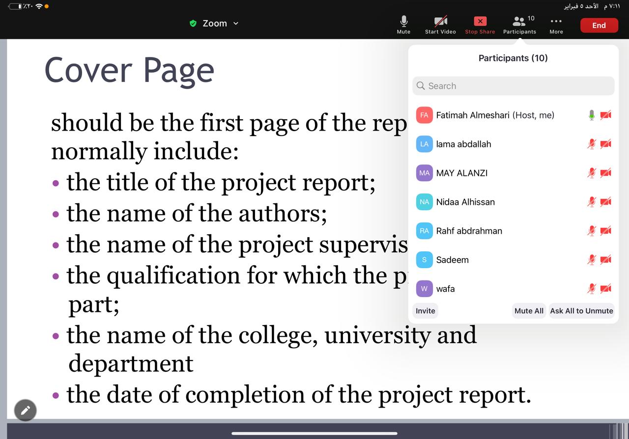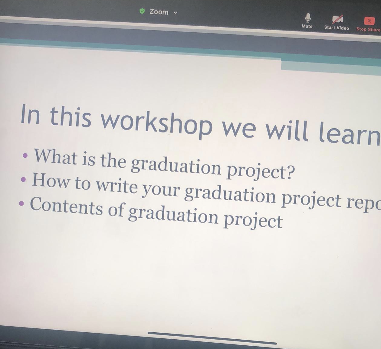 يُعد إعداد وثيقة مشروع التخرج بشكل جيد ومكتمل طبقاً للمواصفات الفنية التي يحددها القسم أحد العقبات التي تواجه الطالبات، وبرعاية رشيدة من سعادة عميدة كلية العلوم والدراسات الإنسانية بحوطة بني تميم د/ حصة بنت سعود الهزاني أقامت وحدة الخريجات ممثلة في لجنة مشاريع التخرج بإشراف د/ هبة الله الويشي دورة تدريبية بعنوان " كتابة تقرير مشروع التخرج" إعداد وتقديم: أ/ فاطمة المشاري المحاضر بقسم اللغة الإنجليزية وذلك يوم الأحد بتاريخ 1444/7/14 هـ الموافق 5/2/2023 م الساعة السابعة مساء عبر برنامج زوم، وبحضور طالبات من مختلف مستويات قسم اللغة الإنجليزية بالإضافة للطالبات المتوقع تخرجهن.