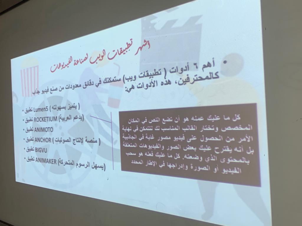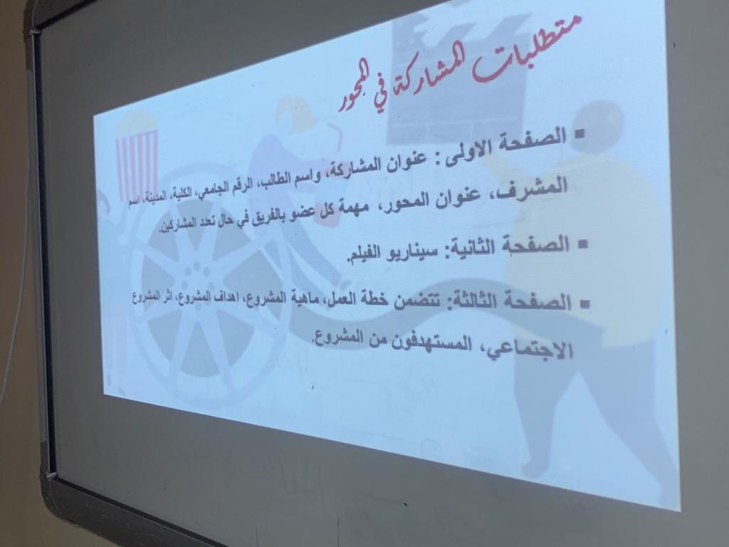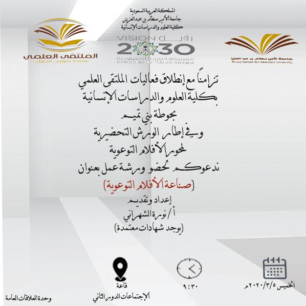 تُعد الأفلام التوعوية أحد أهم الأدوات التي تساهم في معالجة القضايا بأسلوب تربوي وتقني وقد تبنى الملتقى العلمي بجامعة الأمير سطام بن عبد العزيز صناعة الأفلام كأحد المحاور المهمة في الملتقى منذ دورته الأولى. وضمن الفعاليات التحضيرية للملتقى بكلية العلوم والدراسات الإنسانية بحوطة بني تميم وتحت قيادة سعادة العميدة الدكتورة حصة سعود الهزاني، أقيمت دورة تدريبية بعنوان (كيف أصنع فيلماً ؟) من إعداد وتقديم الأستاذة نورة الشهراني يوم الأربعاء الموافق: 10\7\1441هـ عند الساعة التاسعة والنصف صباحاً بقاعة التدريب. في بداية الدورة تم الترحيب بالحضور وشكرهن على المشاركة ثم ابتدأ التعريف بمحور الأفلام وضوابط الفيلم الجيد من امتلاك الإبداع والإمتاع والإقناع. ثم تم توضيح مراحل انتاج الفيديو ابتداء بفكرة بسيطة حتى وصل إلى فيديو مصمم باحترافية مع شرح كل مرحلة وتوضيح المعدات والبرامج المناسبة لذلك. في نهاية الدورة تم التدريب والتطبيق العملي على البرنامج وتصميم فيديو قصير مع الطالبات. كما تم تحفيز الطالبات بالكلية للمشاركة بالمحور للاستفادة من مواهب وإبداع الطالبات في تحقيق فائدة للمجتمع