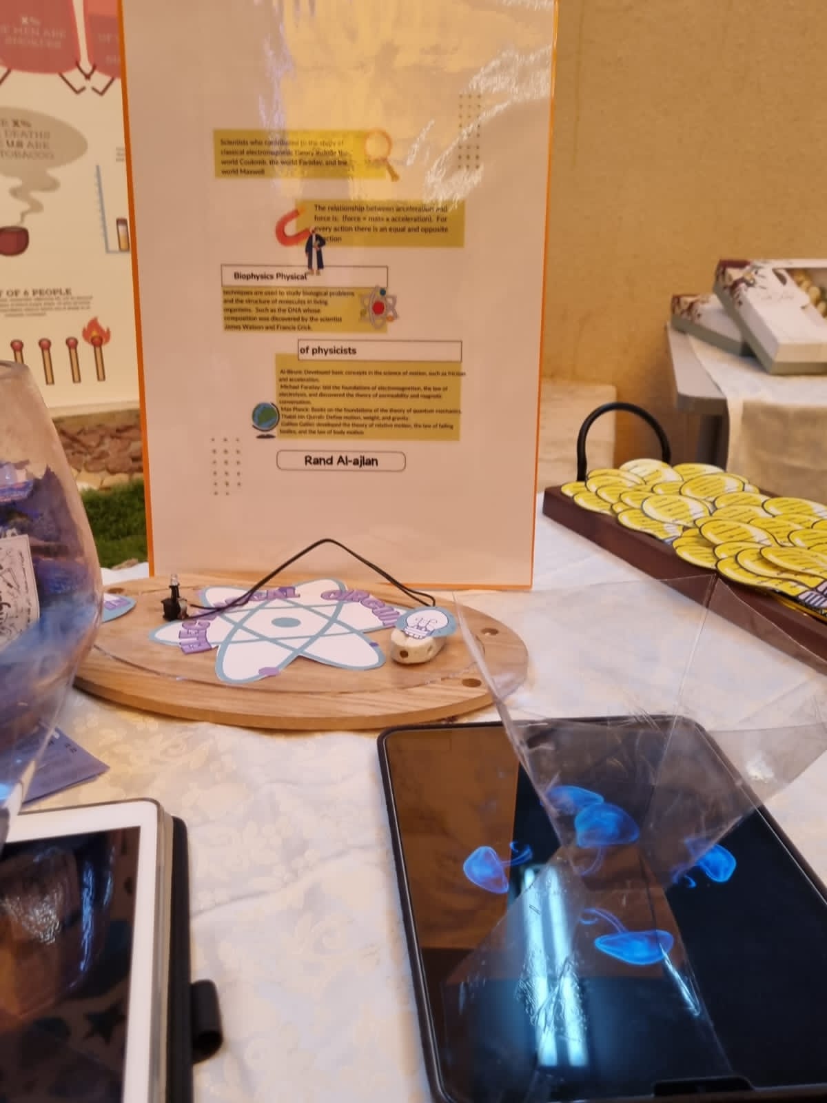 ثالثًا: ركن الفيزياء بإشراف د. فرحة الفاضل ود. لطيفة بن عمار و أ. نورة المرير، حيث تكتشف من خلال هذا الركن عالمك بنظرة أعمق عن المعتاد اشتمل على عدة تجارب وهي: تجربة الهولوجرام، وتجربة انكسار الضوء، وتجربة الدائرة الكهربائية والفقاعات بالإضافة الى ركن الضيافة.