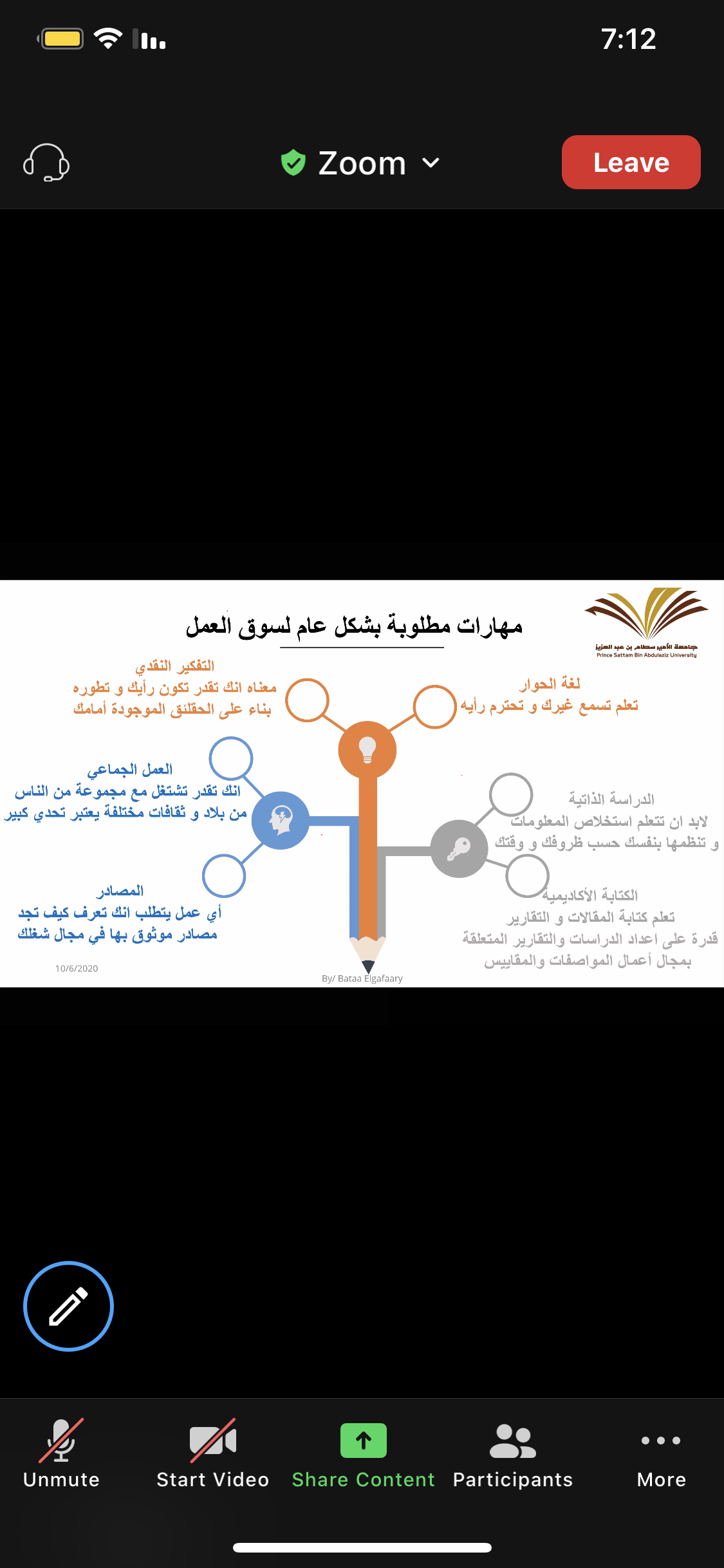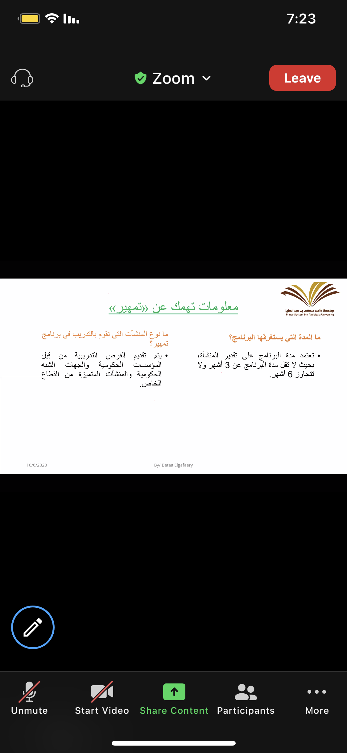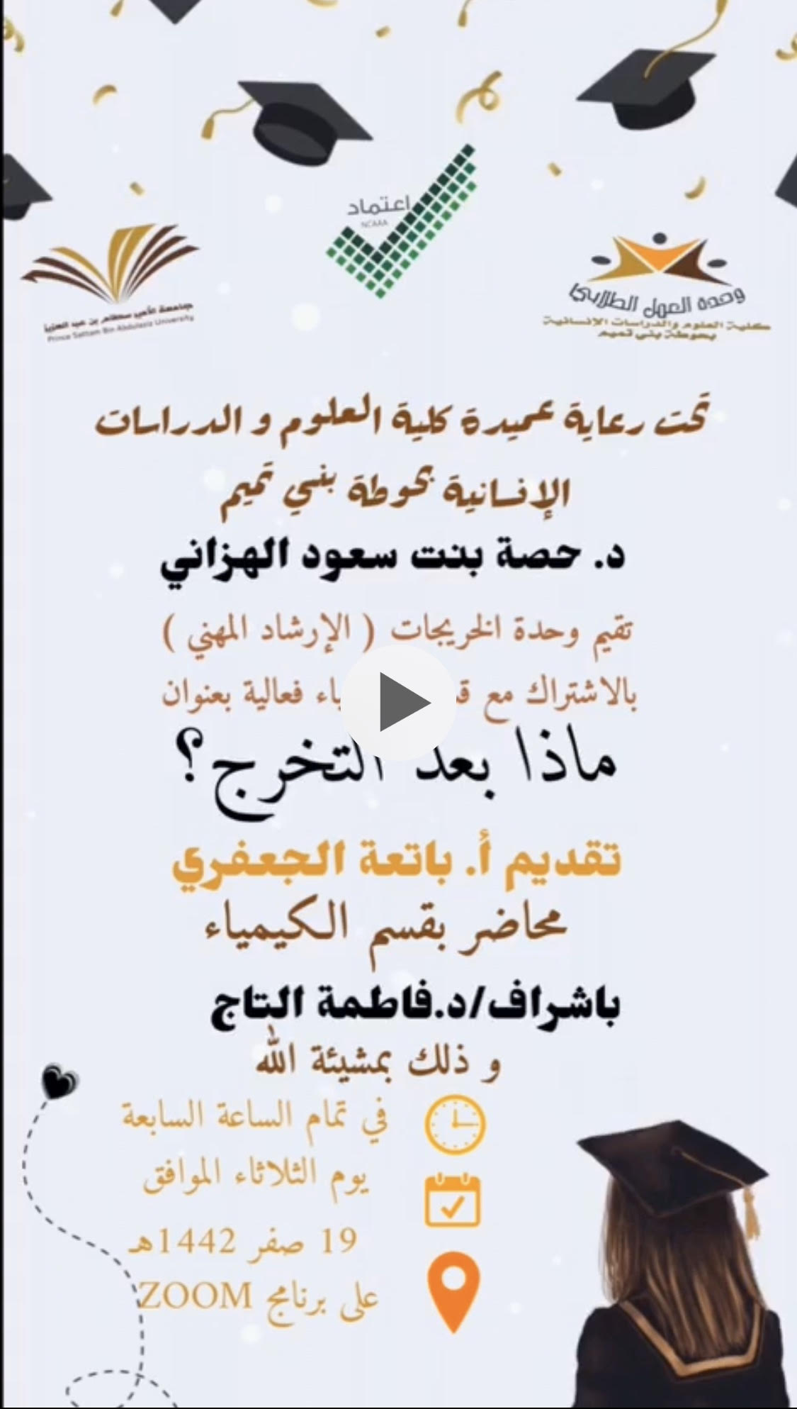 أقامت وحدة الخريجات ( الإرشاد المهني ) بالاشتراك مع قسم الكيمياء بكلية العلوم و الدراسات الإنسانية بحوطة بني تميم تحت قيادة عميدة الكلية المكرمة / د. حصة بنت سعود الهزاني. فعالية بعنوان " ماذا بعد التخرج؟" تقديم ا. باتعة عامر الجعفري محاضر بقسم الكيمياء، و ذلك في يوم الثلاثاء الموافق: 1442/2/19هـ تمام الساعة السابعة مساءً عبر برنامج Zoom. بحضور منسقة لجنة الإرشاد المهني بالكلية د. فاطمة التاج و عدد (49) طالبة من قسم الكيمياء، حيث بدأت الفعالية بتعريف الطالبات بالاستعدادات الواجب إتباعها استعداداً لحياة ما بعد التخرج و تحقيق حلم الحصول على الوظيفة المناسبة، و تم استعراض المسارات المهنية المتاحة لتخصص كيمياء. تلى ذلك توضيح للمهارات المطلوبة بشكل عام لسوق العمل و تقسيمها لمهارات مكتسبة و مهارات شخصية و توضيح كلا منهما، و مدى تأثير افتقاد الطالبات لأي من هذه المهارات أو على الفوز بالوظائف الملائمة، و ما هي القدرات الشخصية المطلوب توفرها للتميز في المهنة . ثم انتقل الحديث إلى استعراض لمبادرات صندوق تنمية الموارد البشرية متمثلة في (برنامج تمهير - منصة دروب - منصة سبل ) و دورها في اكساب الخريجات الخبرات والمهارات.