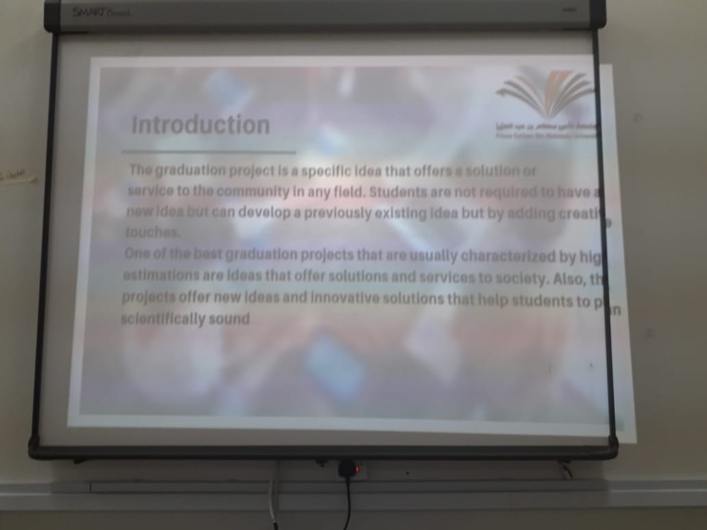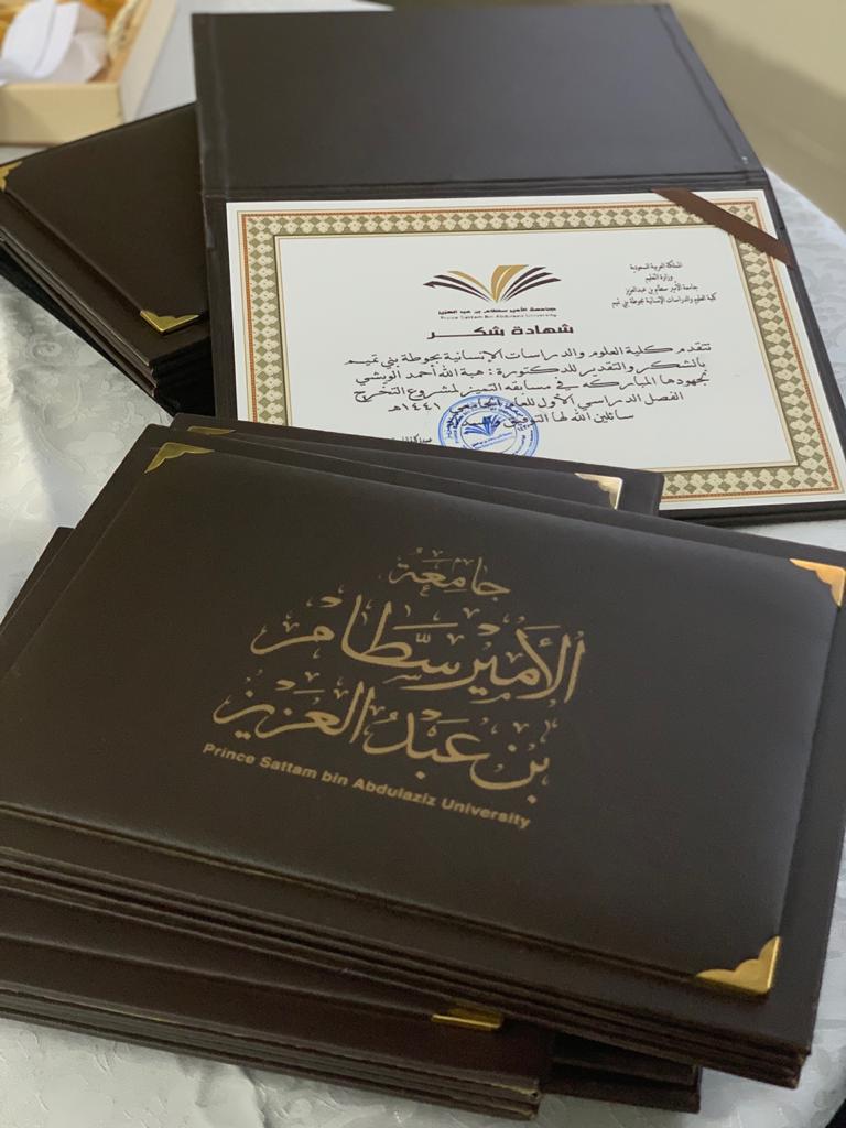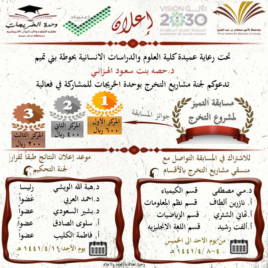 في ختام فعاليات لجنة مشاريع التخرج بوحدة الخريجات للفصل الدراسي الأول من العام الجامعي 1441هـ ، و في ظل قيادة عميدة كلية العلوم و الدراسات الإنسانية بحوطة بني تميم د/ حصة بنت سعود الهزاني و رغبتها السامية في تشجيع الطالبات و دعم روح المنافسة ، أعلنت مسابقة التميز لمشروع التخرج بين الأقسام العلمية ممثلة في قسم نظم المعلومات و الكيمياء و الرياضيات و اللغة الإنجليزية خلال الفترة من الأحد إلى الخميس4 -1441/4/8هـ بجوائز مالية قدرها 1200 ريال موزعة 600 ريال للجائزة الأولى، 400 ريال للجائزة الثانية و 200 ريال للجائزة الثالثة. و قد تقدم للمسابقة خمسة مشاريع مشروعان من قسم نظم المعلومات ومشروع من قسم الكيمياء، و مشروع من قسم الرياضيات، و مشروع من قسم اللغة الإنجليزية. و تم إعلان النتائج يوم الأحد الموافق: 1441/4/11هـ في تمام الساعة العاشرة صباحا بحفل بهيج بقاعة الاجتماعات بالكلية بعد أن أختلت لجنة التحكيم للتداول برئاسة د/ هبة الله أحمد الويشي و عضوية كل من د/ أحمد سعيد العربي و د/ بدر عبد العزيز التميمي و أ/ فاطمة عبد العزيز الكليب و أ/ سلوى الصادق. أصدرت اللجنة قرارها بفوز مشروعي قسم نظم المعلومات بالمركز الأول مناصفة حيث المشروع الأول بعنوان Smart Lawyer Management System و المشروع الثاني بعنوان Graduation Project System، بينما فاز مشروع قسم الكيمياء بالمركز الثاني و عنوانهGreen Catalytic Oxidation of Benzyl Alcohol في حين فاز مشروع قسم اللغة الإنجليزية بالمركز الثالث و عنوانه The use of Games and Pictures in Teaching Vocabulary in Saudi Primary Schools. و قد شرفت الحفل سعادة عميدة الكلية الفاضلة د/ حصة بنت سعود الهزاني التي سلمت الجوائز المادية و الكؤوس و الميداليات للفائزات و عددهم (13) طالبة. واختتمت سعادتها الاحتفالية بتوزيع شهادات الشكر لأعضاء هيئة التدريس من أعضاء لجنة التحكيم و مشرفي المشاريع و منسقي لجنة المشاريع تقديراً لجهودهم الكريمة في المسابقة التي أتت ثمارها .