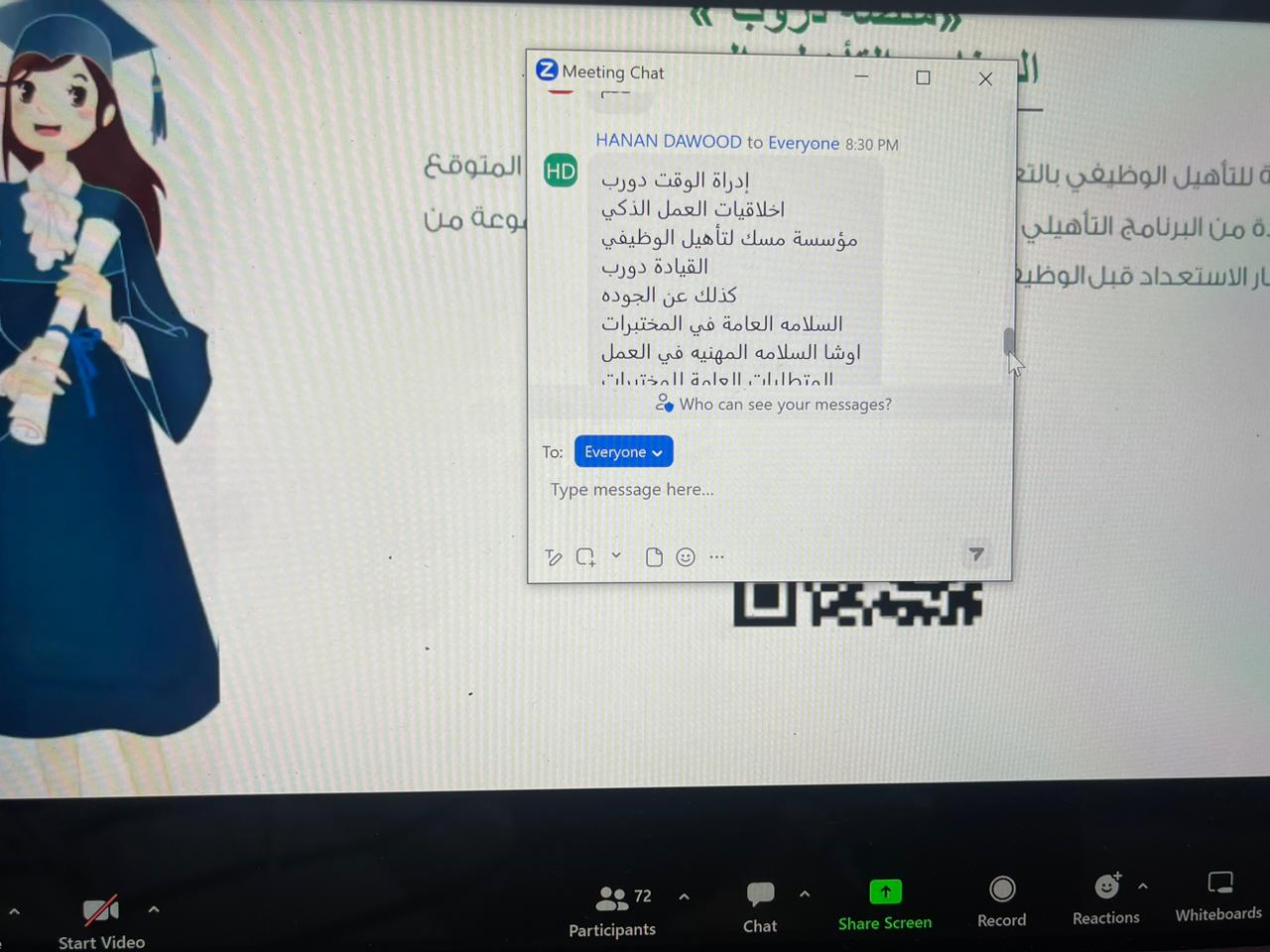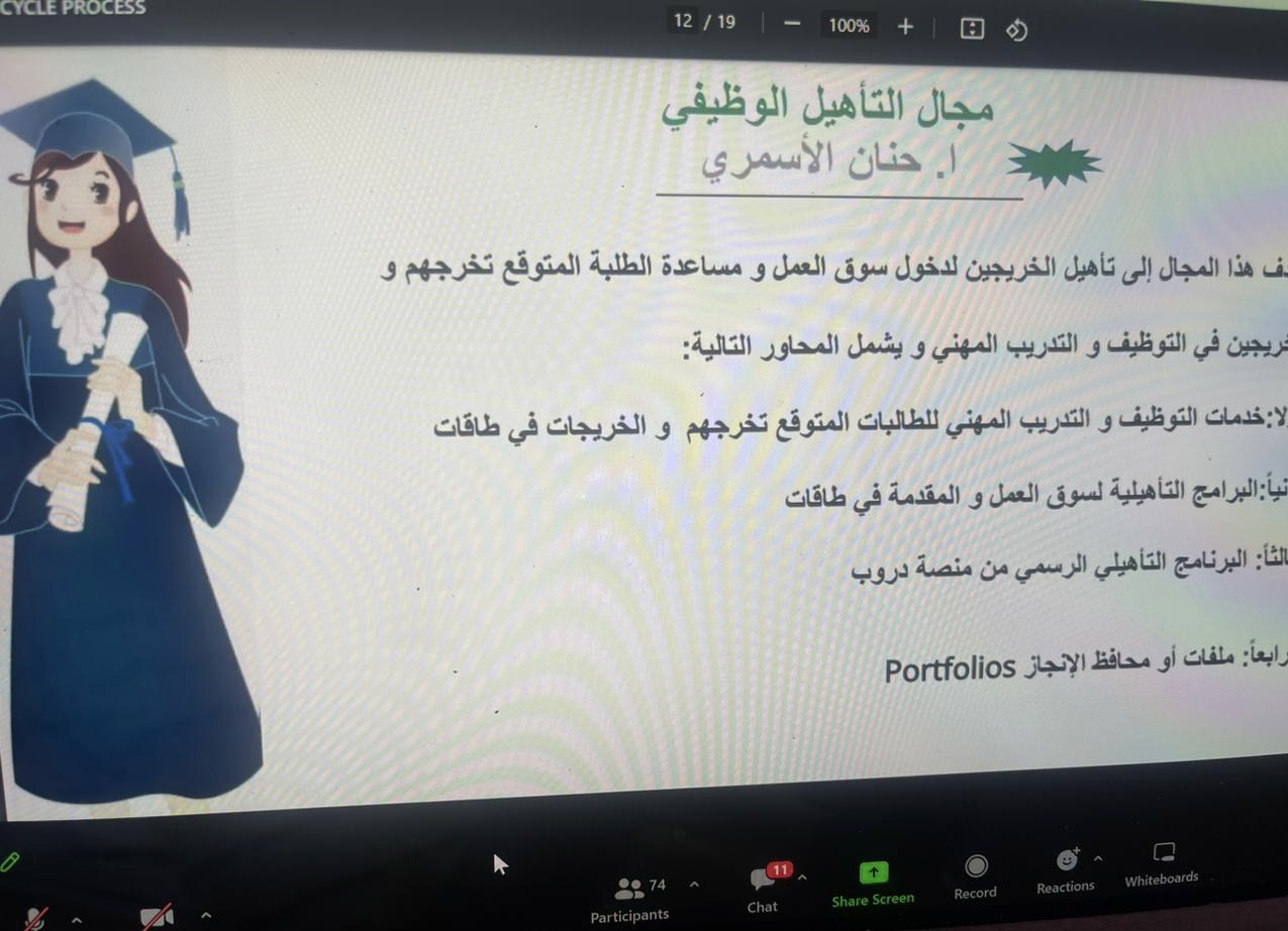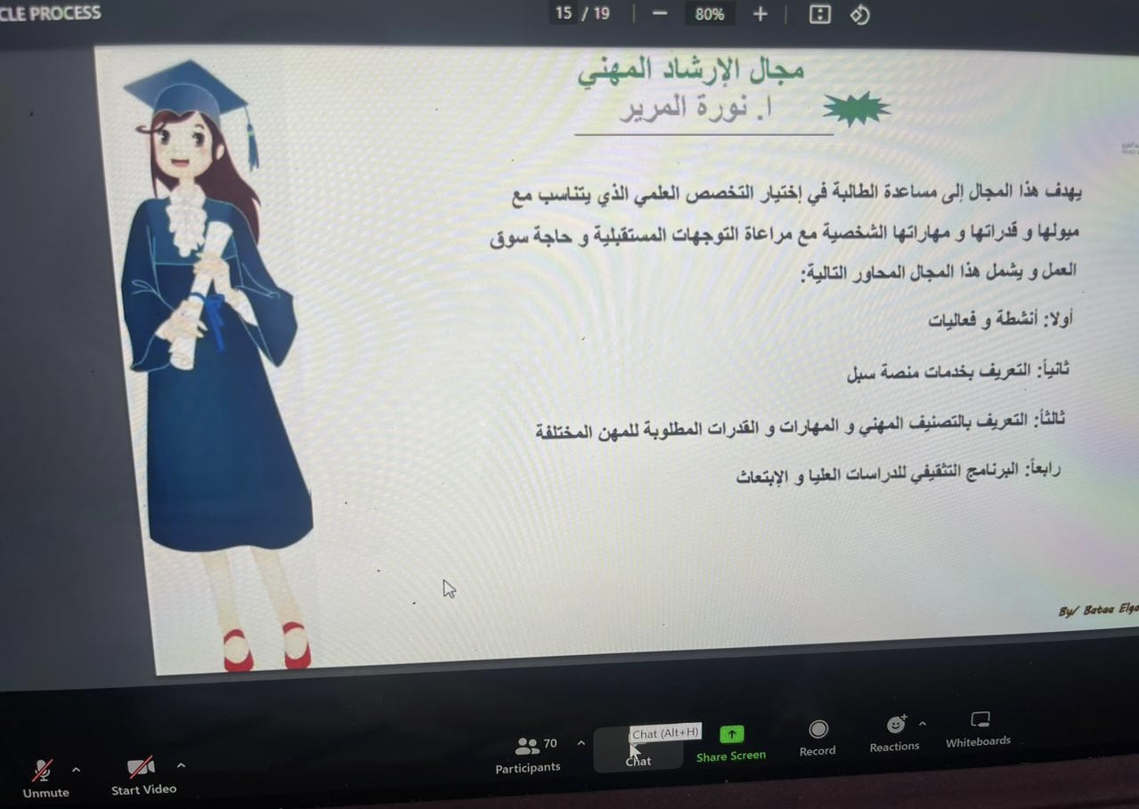 كما استعرضت ا. حنان الأسمري منسقة لجنة التأهيل الوظيفي أهم أهداف اللجنة والتعريف بمنصات التوظيف الوطنية مثل دروب وطاقات وكيف تستفيد الطالبة وترفع مهاراتها وخبراتها في مجال التوظيف، أيضًا تحدثت أ. نورة المرير منسقة لجنة الإرشاد المهني عن أهم مجالات الإرشاد المهني والتعريف بمنصة سبل والتعريف أيضا بالتصنيف المهني وبرنامج الابتعاث الداخلي والابتعاث الخارجي (سفير).