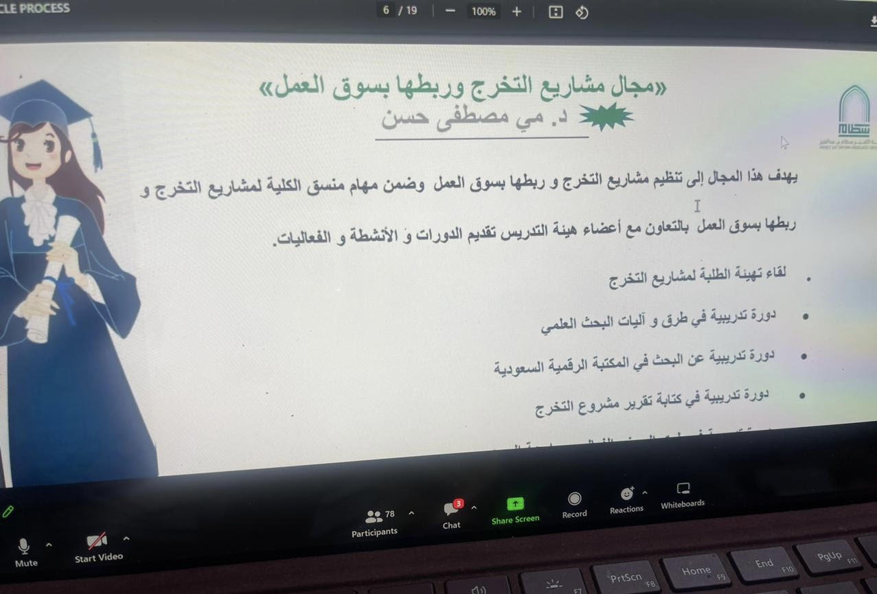 وقد أنشئت لجان لمشاريع التخرج بالكليات تتبع وحدة الخريجات لتحقيق هذه القواعد بإشراف أعضاء هيئة تدريس مؤهلين لهذه المهمة كان هذا ضمن تعريف للجنة المشاريع ألقتها منسقة اللجنة د. مي مصطفي حسن.