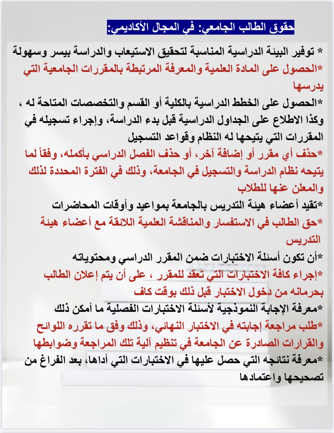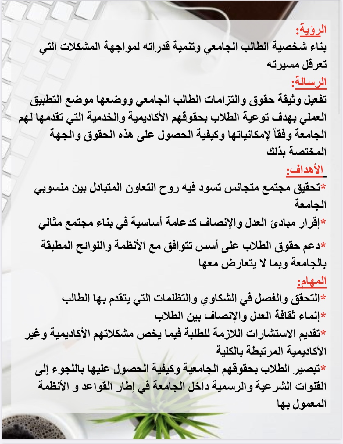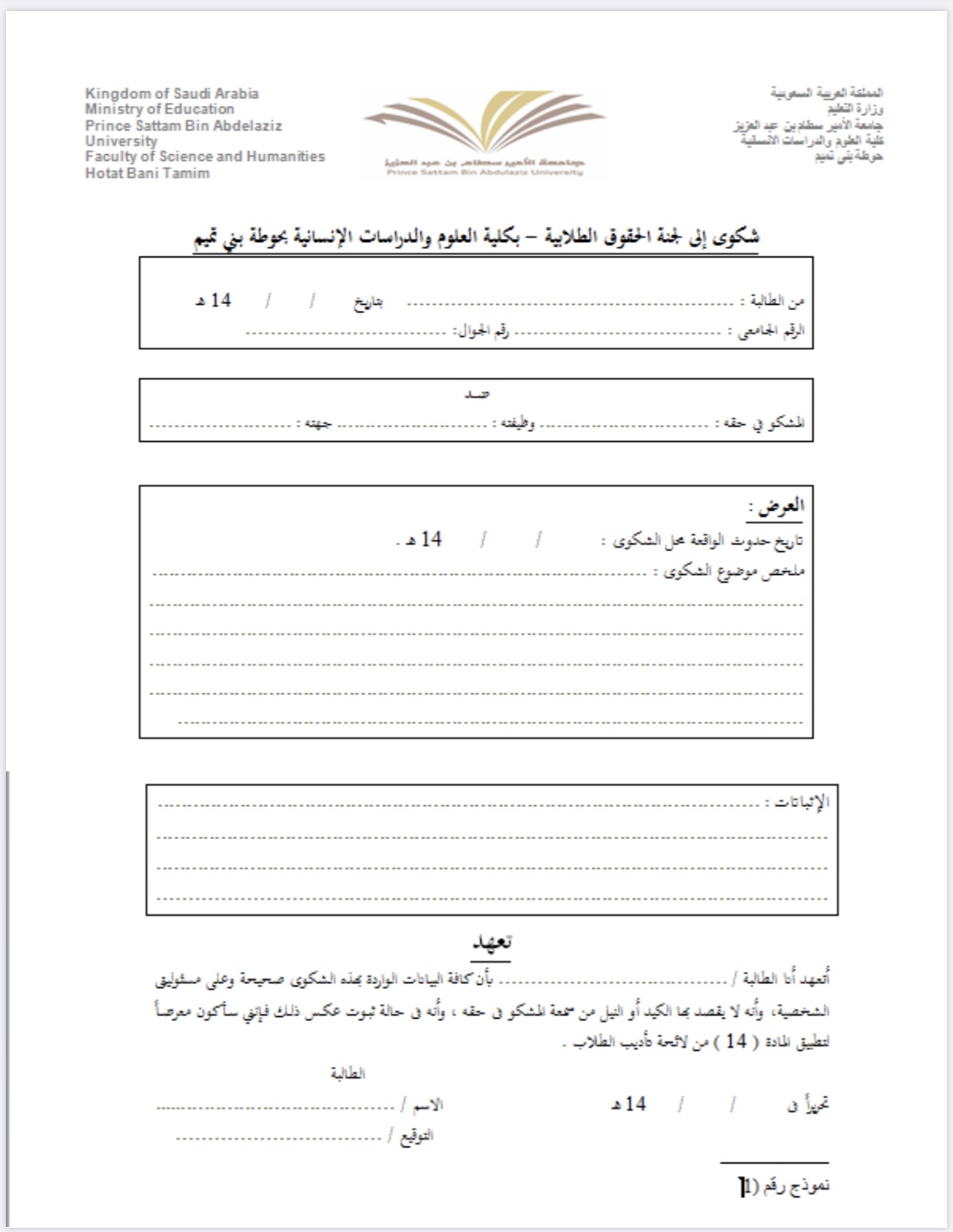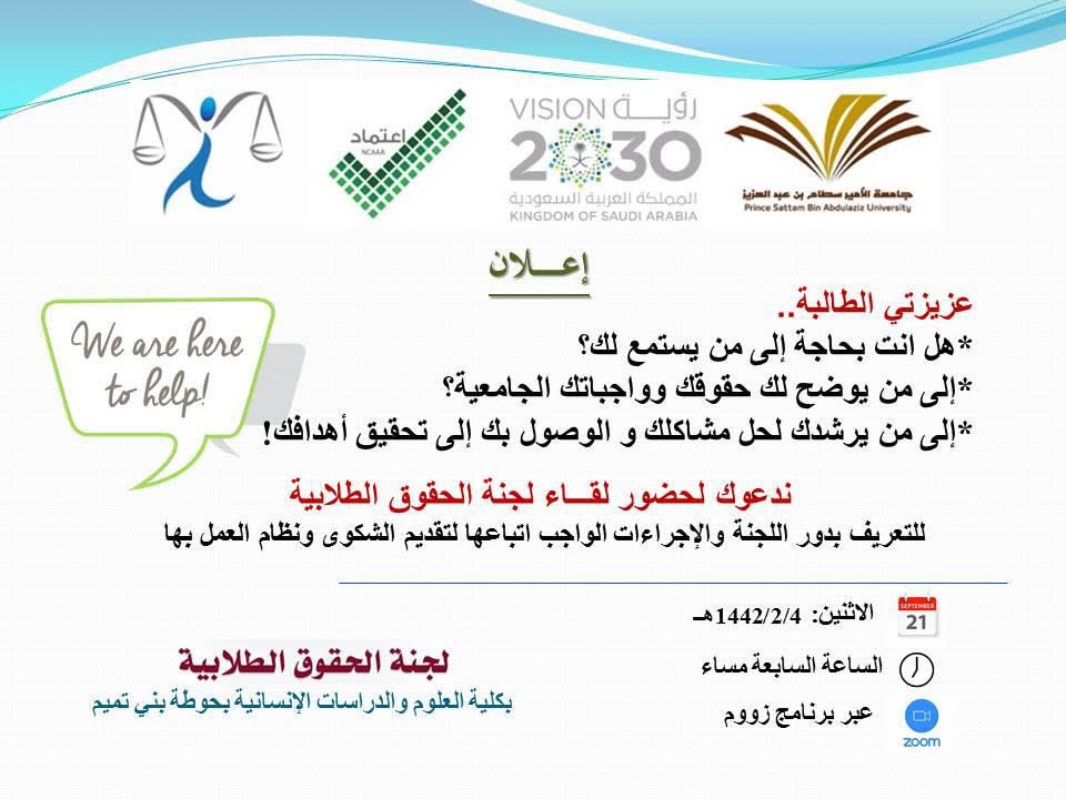 تحقيقاً لأهداف وحدة الإرشاد الأكاديمي نفذت لجنة الحقوق الطلابية بكلية العلوم والدراسات الإنسانية بحوطة بني تميم تحت قيادة عميدة الكلية د/ حصة سعود الهزاني, لقاء افتراضياً للتعريف بمهام و أهداف لجنة الحقوق الطلابية والإجراءات الواجب اتباعها لتقديم الشكوى ونظام العمل بها، كذلك التعريف بأعضاء اللجنة وطريقة التواصل، وذلك في يوم الاثنين الموافق: 1442/2/4هـ, في تمام الساعة السابعة مساء عبر برنامج زووم. حيث أن الهدف من هذه اللجنة هو توعية الطالبة بحقوقها و واجباتها الأكاديمية وغير الأكاديمية، وبيان طرق الحصول عليها، ودعمها بما يتوافق مع أنظمة الجامعة .هذا واختتم اللقاء بإجابة أعضاء اللجنة على أسئلة واستفسارات الطالبات.