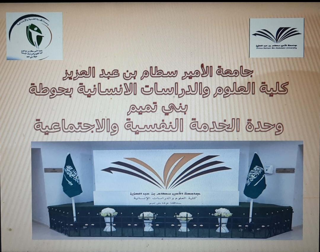 أقامت وحدة الخدمة النفسية والاجتماعية بكلية العلوم والدراسات الانسانية بحوطة بني تميم تحت رعاية عميدة الكلية دكتورة / حصة بنت سعود الهزاني. لقاء تعريفي بعنوان (حللتم أهلا ووطئتم سهلا) وذلك في يوم الأربعاء الموافق/ ١٣صفر1442هـ، في الساعة 8 مساءً، عبر تطبيق zoom. للتعريف بالوحدة والخدمات التي تقدمها والمتمثلة في الخدمات النفسية والاجتماعية وبعض الاليات المستخدمة كالإرشاد والتحصين والعلاج، كما تم توضيح شروط وخطوات التقديم للسلف والاعانات، وتم الرد على الاسئلة والاستفسارات المقدمة من الطالبات.