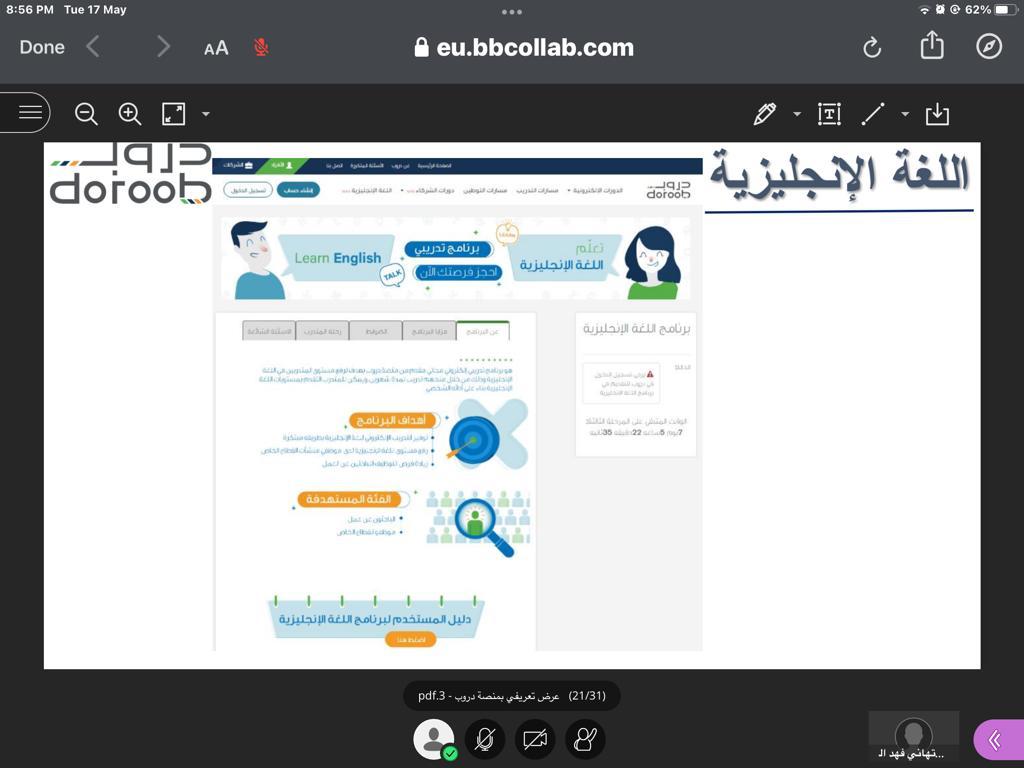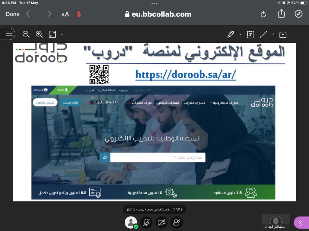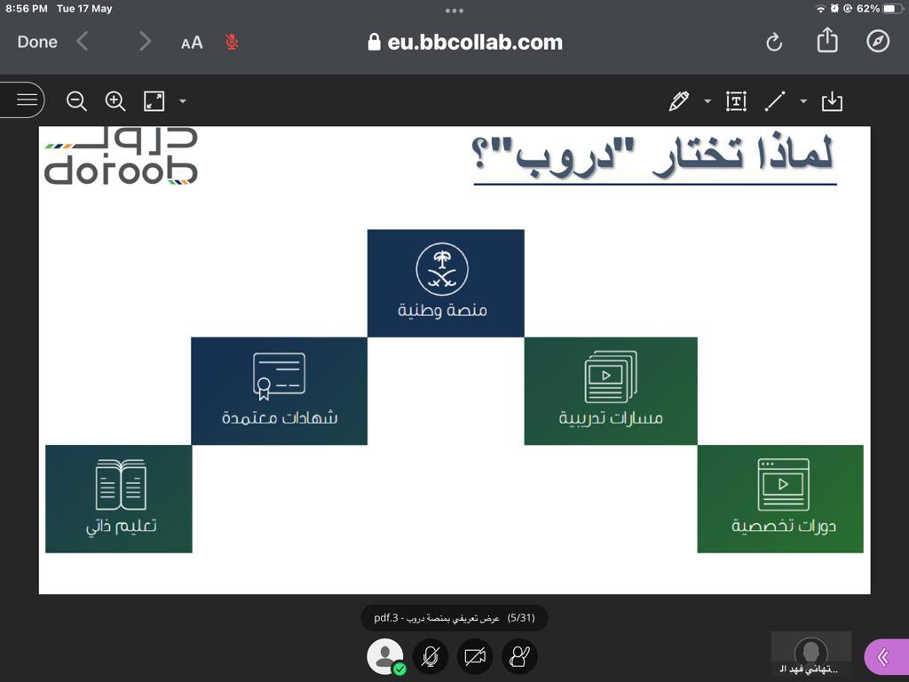 تناول اللقاء: نوع الدورات التدريبية المقدمة من دروب، مسارات التدريب المتاحة على المنصة، مسارات التوطين المتاحة على المنصة، كيفية الحصول على شهادات اجتياز الدورات. وفي نهاية اللقاء تم حث الطالبات على الاستفادة من هذه الدورات الإلكترونية على الرابط: www.doroob.sa.