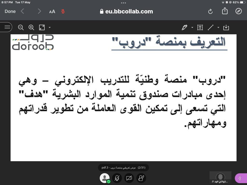 من منطلق سعي الجامعة لتوفير فرص معتمدة للتدريب المهني والتأهيل الوظيفي للطلاب والخريجين لتنمية قدراتهم ومهاراتهم الشخصية وتأهيلهم للمنافسة في سوق العمل، أقامت وحدة الخريجات بكلية العلوم والدراسات الإنسانية بحوطة بني تميم لقاءً افتراضيًا بعنوان: "التعريف بمنصة دروب" تحت رعاية عميدة الكلية سعادة الدكتورة/ حصة بنت سعود الهزاني، و كان اللقاء في مجال التأهيل الوظيفي وذلك يوم الثلاثاء الموافق: 1443/10/16هـ، قدمت الدورة الأستاذة: تهاني الشثري( محاضر بقسم نظم الرياضيات بالكلية)، ومن أهم أهداف اللقاء تعريف الطالبة على برنامج دروب الذي يوفر أكثر من 170 دورة إلكترونية في مجالات متعددة ويتم الحصول على الدورة عن بُعد، كما يتم منح من اجتاز الدورة شهادة معتمدة من صندوق تنمية الموارد البشرية "هدف".