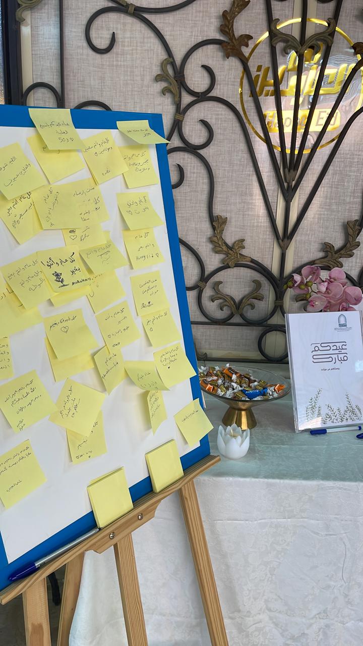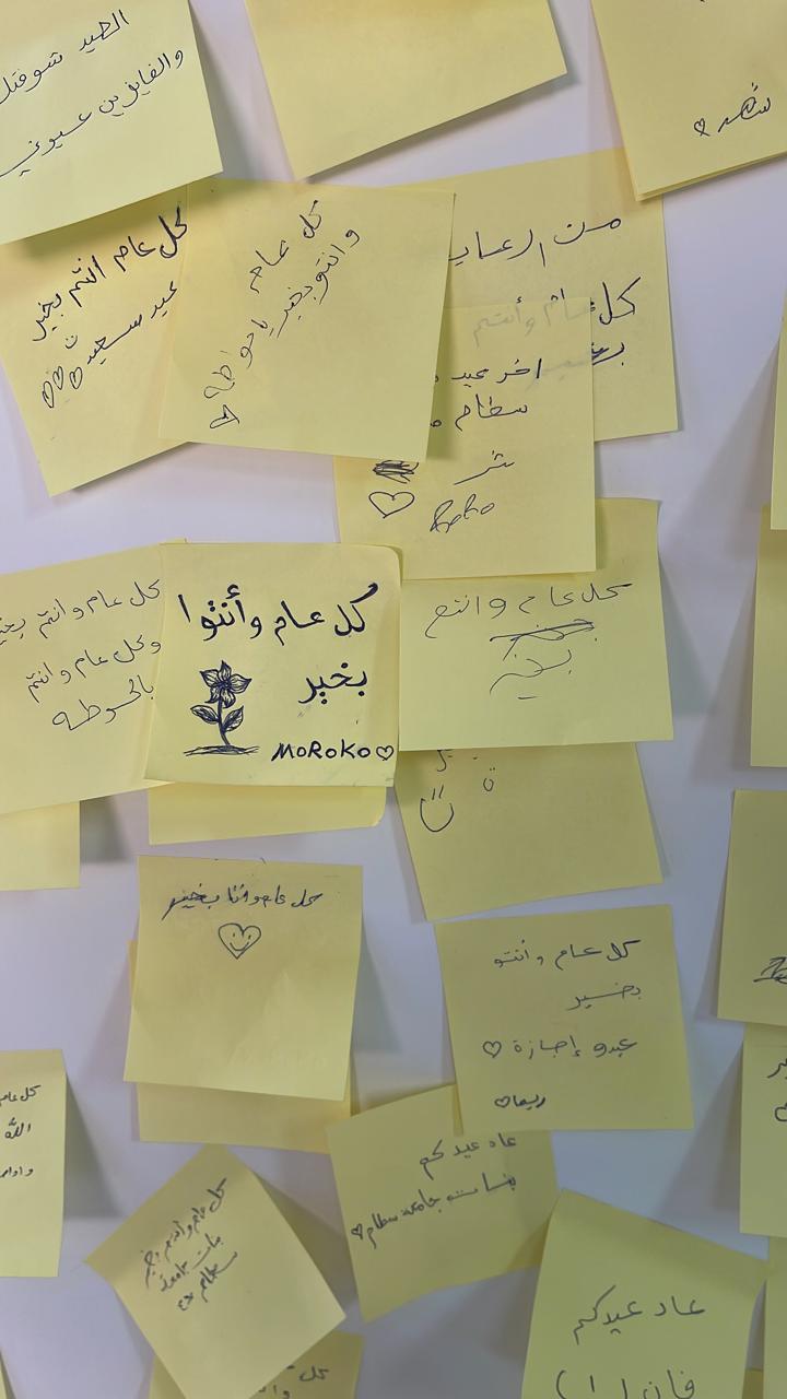 حيث قام عدد من طالبات الكلية بإرسال عبارات التهنئة عبر لوحة المعايدة للجميع لبث روح الأنس والفرح أعاده الله على الجميع باليمن والبركات.