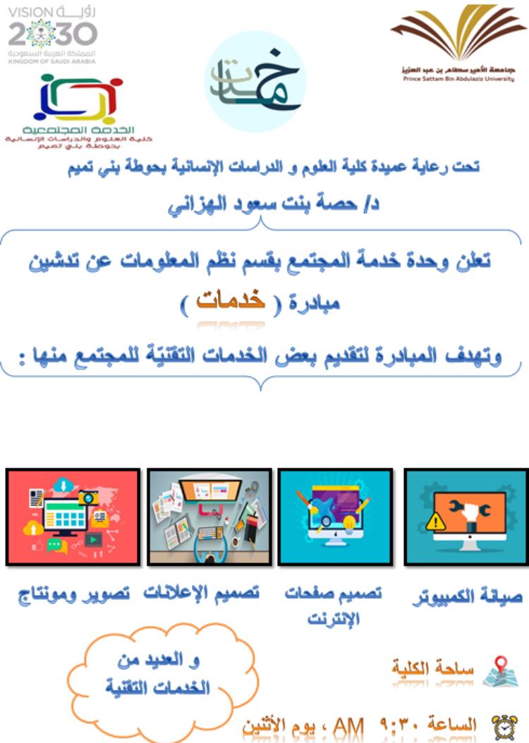 نظراً للتطور المتسارع في تكنولوجيا تقنية المعلومات والخدمات الإلكترونية دشنت وحدة الخدمة المجتمعية بقسم نظم المعلومات مبادرة بعنوان (خدمات) بقيادة عميدة كلية العلوم والدراسات الإنسانية بحوطة بني تميم الدكتورة /حصة بنت سعود الهزاني يوم الاثنين الموافق :1441/2/28هـ. وتهدف المبادرة لتقديم بعض الخدمات التقنية للمجتمع من ضمنها (صيانة الحاسب- تصميم صفحات الإنترنت – التصوير والمونتاج - وتصميم الإعلانات - وتعليم الرسم بالحاسوب).