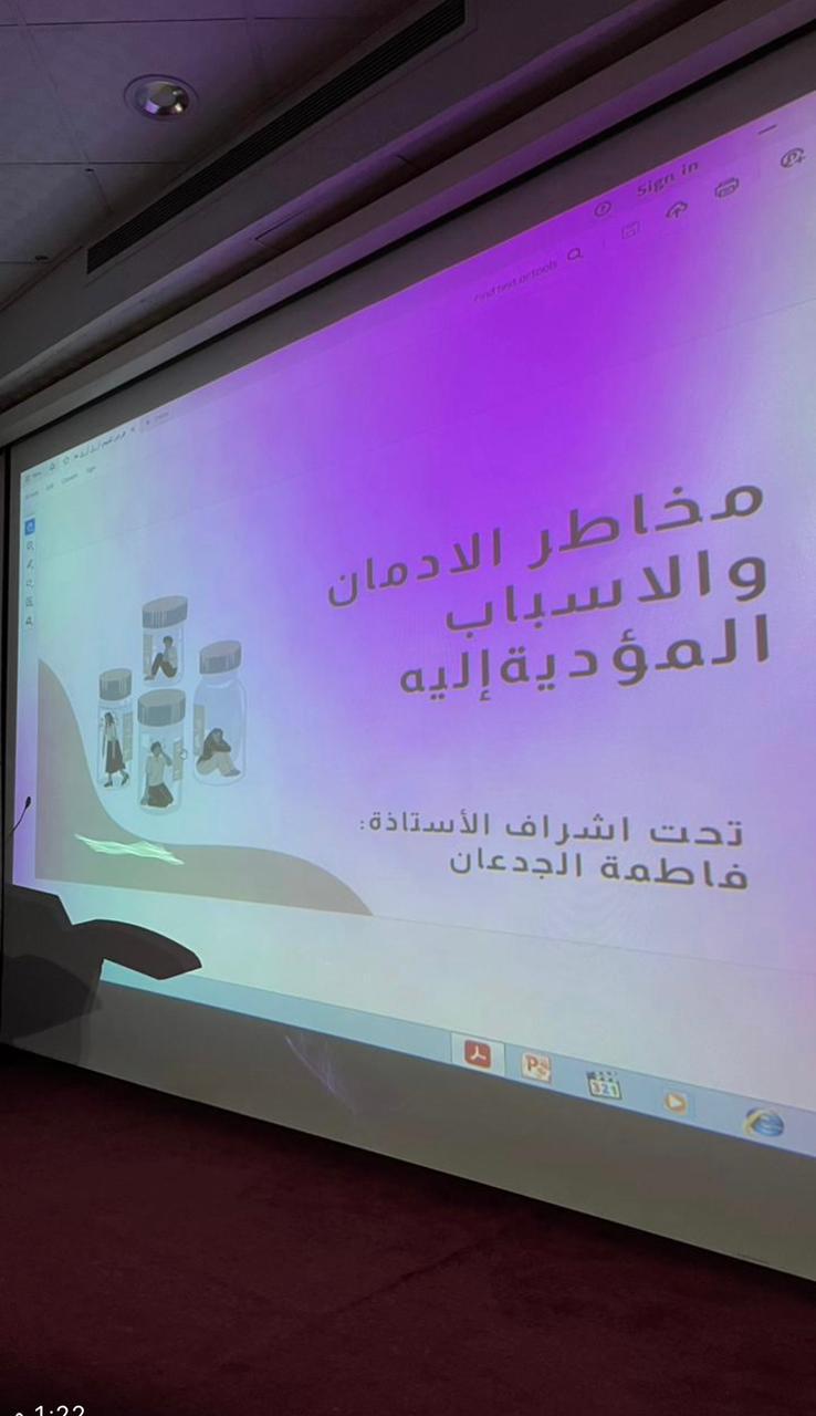 تحت رعاية عميدة كلية العلوم والدراسات الإنسانية بحوطة بني تميم د. حصة بنت سعود الهزاني قدمت لجنة التوعية بمكافحة التدخين والمخدرات محاضرة بعنوان: (الإدمان تعريفه وأسبابه)، وذلك في يوم الأربعاء الموافق ١٤٤٥/٤/٣ هـ الساعة ٩:٣٠ صباحًا بمسرح الكلية.