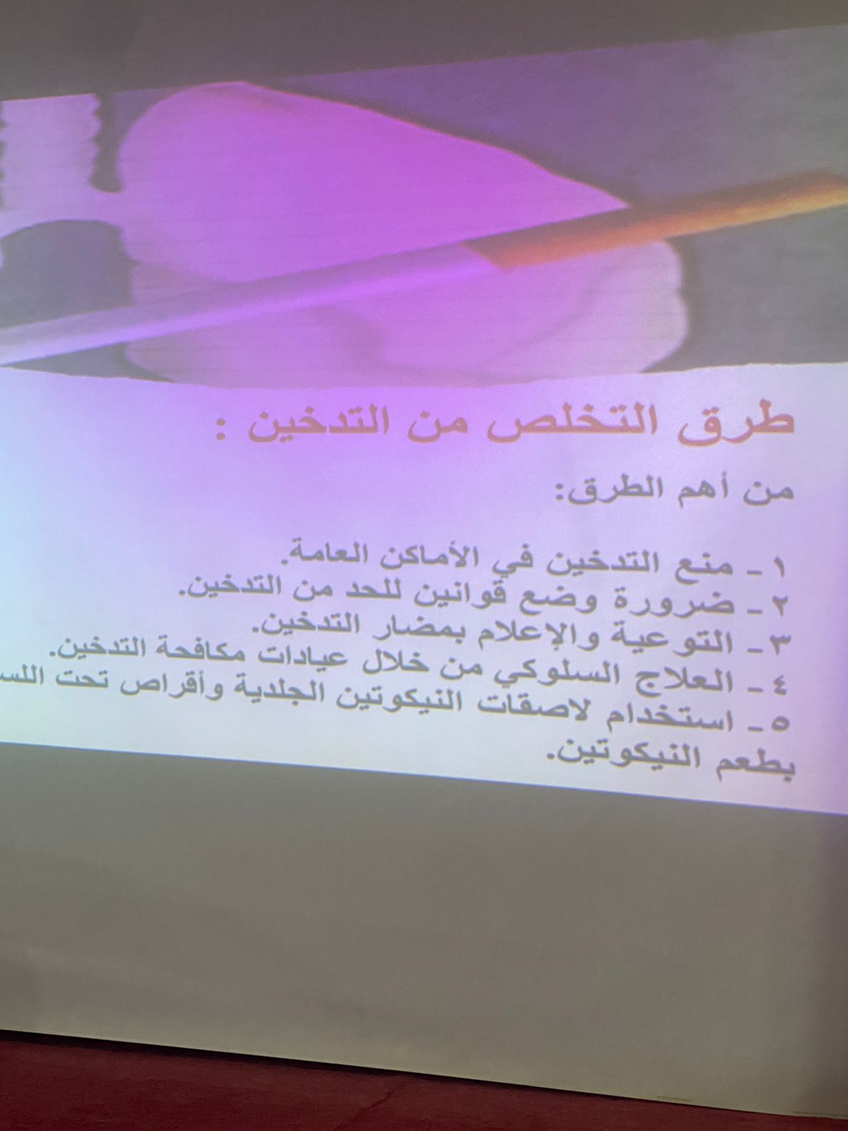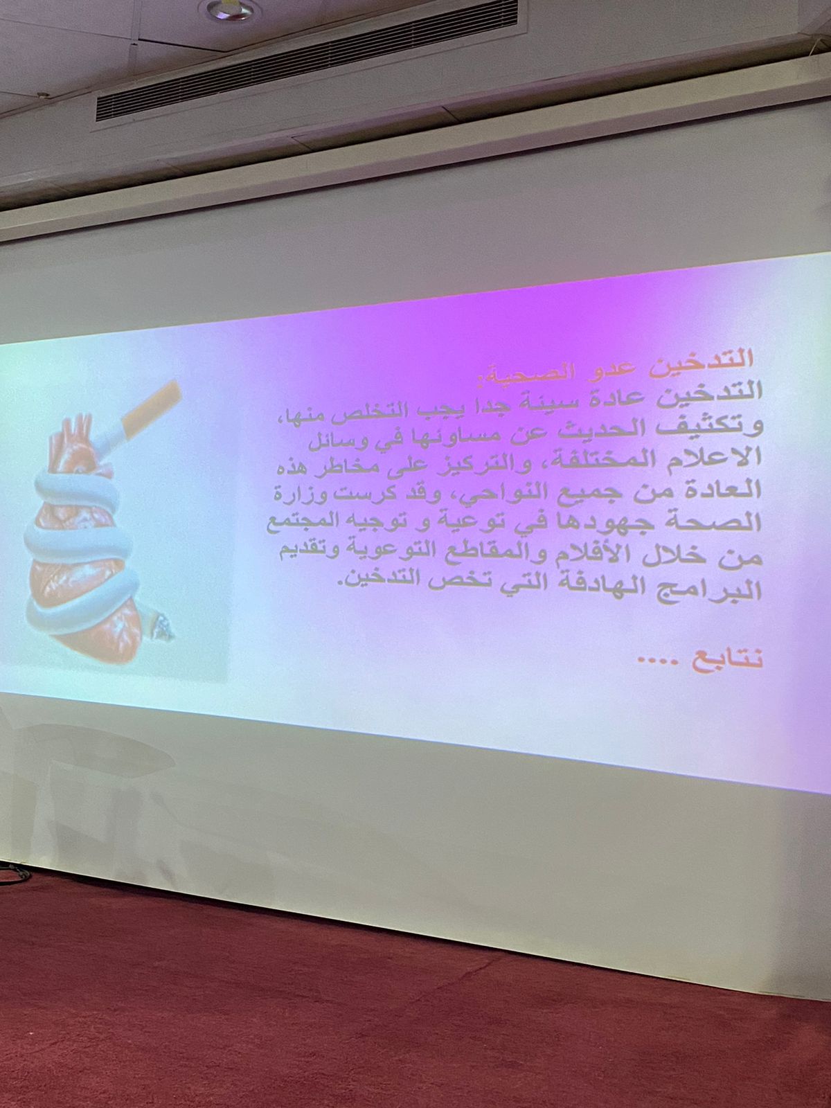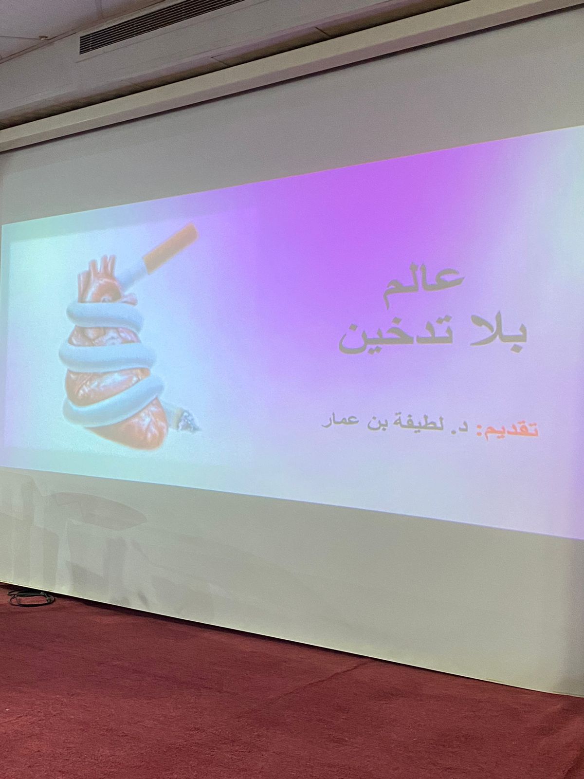أن سيجارة المدخن تحتوي على الكثير من المواد الكيميائية السامّة التي تسبب الأمراض، ولأهمية ذلك، وتحت رعاية عميدة كلية العلوم والدراسات الإنسانية بحوطة بني تميم د. حصة بنت سعود الهزاني قدمت لجنة مكافحة التدخين بالجامعة والخدمة المجتمعية بالتعاون مع لجنة العمل المشترك مع المديرية العامة لمكافحة المخدرات في الجوانب التوعوية والتدريبية محاضرة بعنوان" عالم بلا تدخين" من تقديم: د. لطيفة بن عمار وتحت إشراف أ. ريم الحضيف وذلك في يوم الثلاثاء الموافق ١٤٤٤/١٠/١٩هـ الساعة ٩:٣٠ صباحًا بمسرح الكلية.