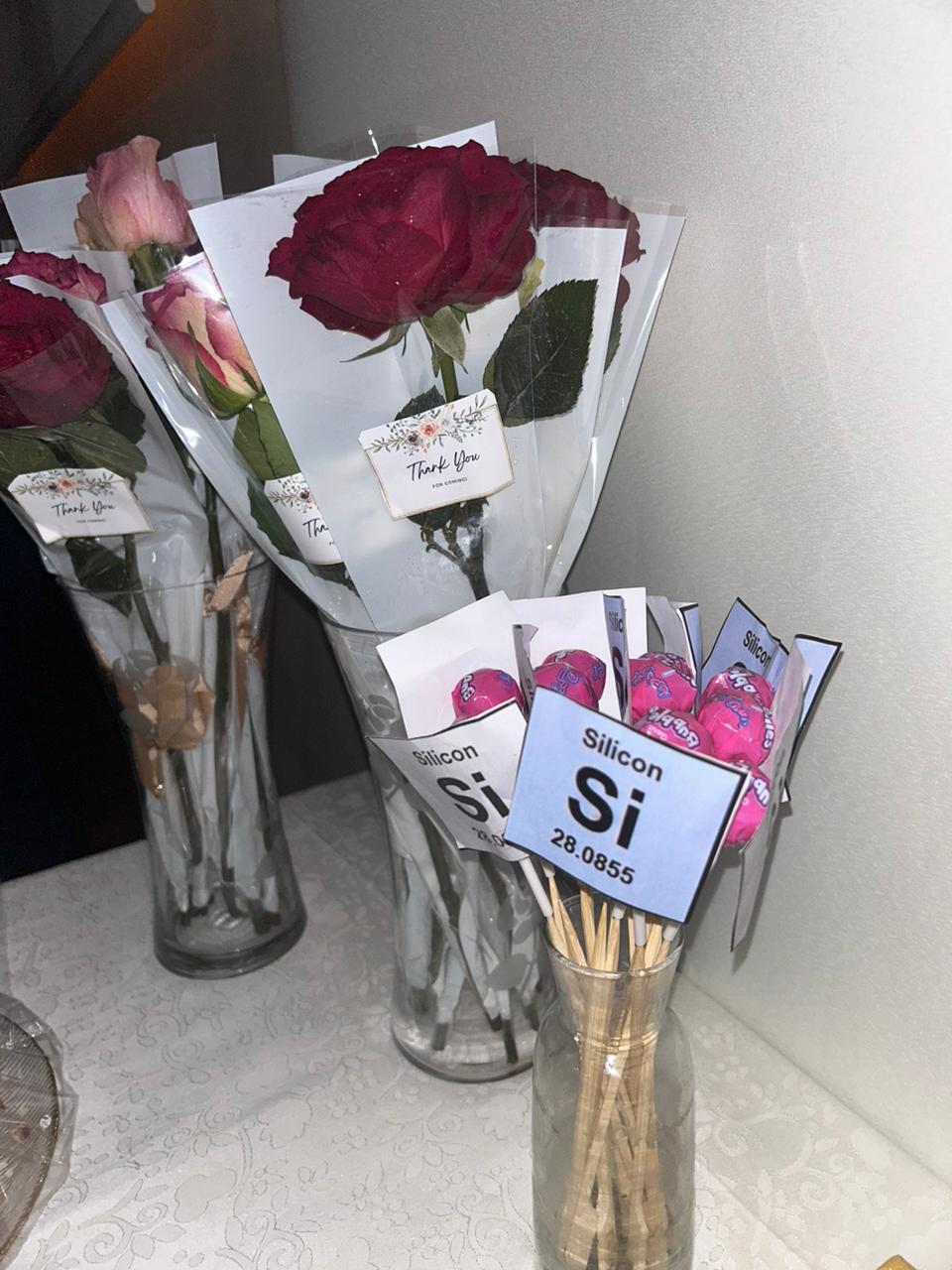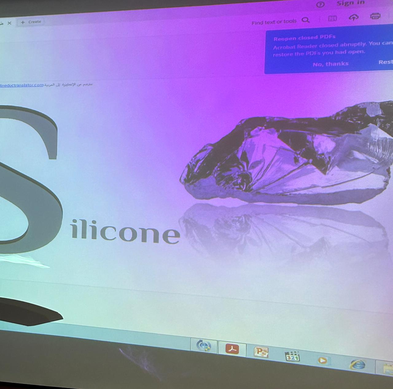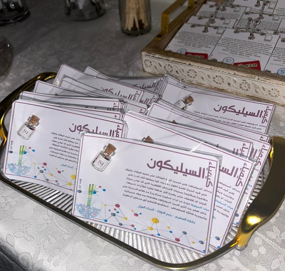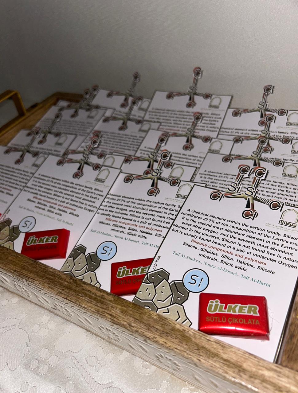 حيث وضحت الطالبات عنصر السليكون كأحد العناصر الكيميائية الأكثر انتشار في القشرة الارضية، وأهم المركبات التي يكونها هذا العنصر والصناعات التي يدخل فيها وأهمها صناعة الرقائق المستخدمة في صناعة الالكترونيات وغيرها.. والعديد من الصناعات في مجالات مختلفة طبية وتجميلية. وفي ختام العرض قدمت الطالبات عدد من التوزيعات والنشرات عن عنصر السليكون ومركباته.