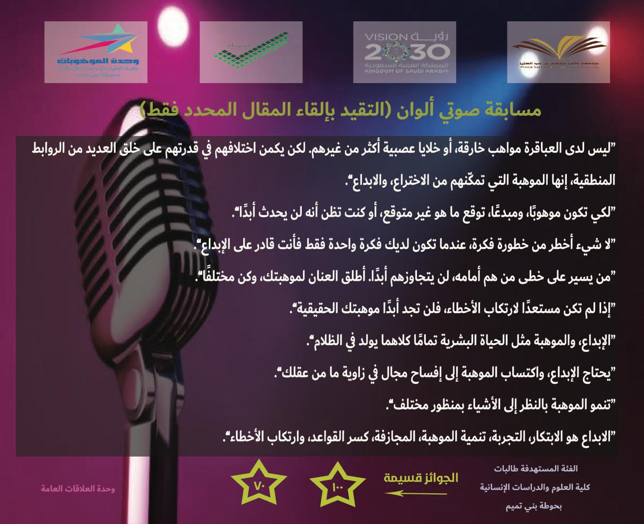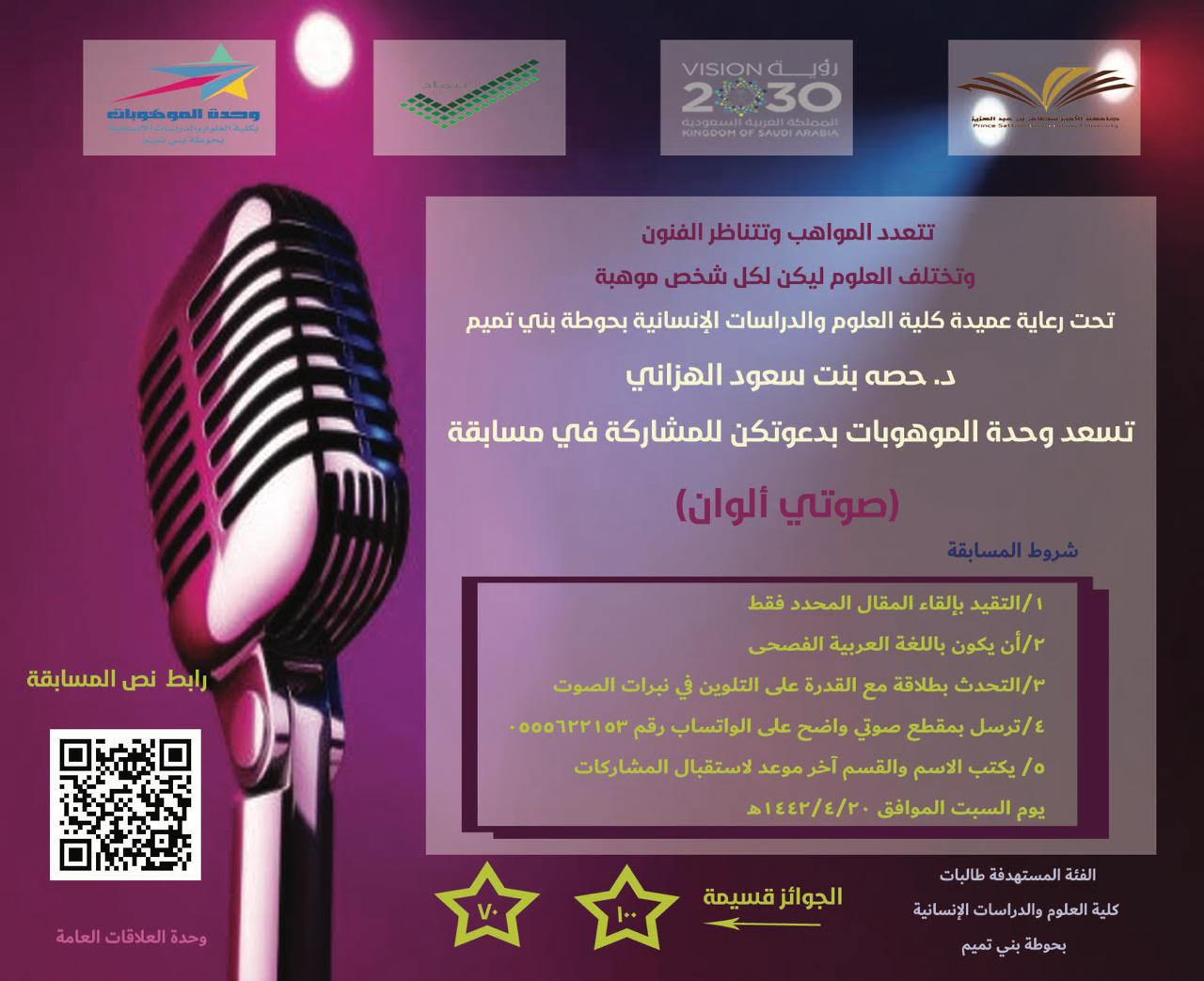 تظل الموهبة سمة تنمو بكل وقت وعصر يجددها النماء وتسمو بالعطاء تحت رعاية عميدة كلية العلوم والدراسات الإنسانية بحوطة بني تميم د. حصة بنت سعود الهزاني. سعدت وحدة الموهوبات بإقامة مسابقة( صوتي ألوان )تحت إشراف مشرفة الوحدة، وتنفيذ أ/منال الدحيم.